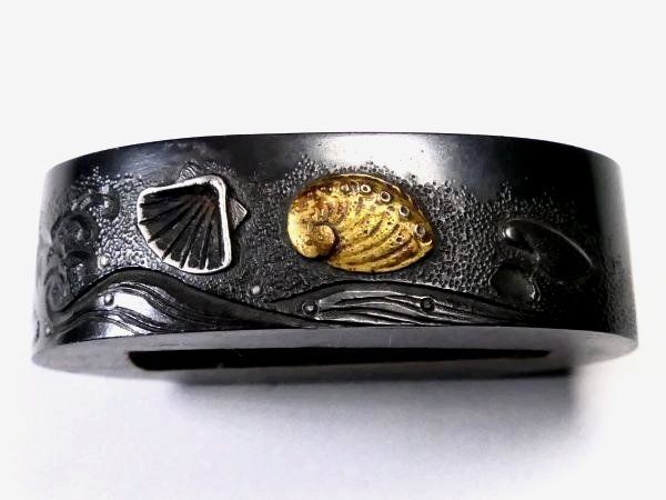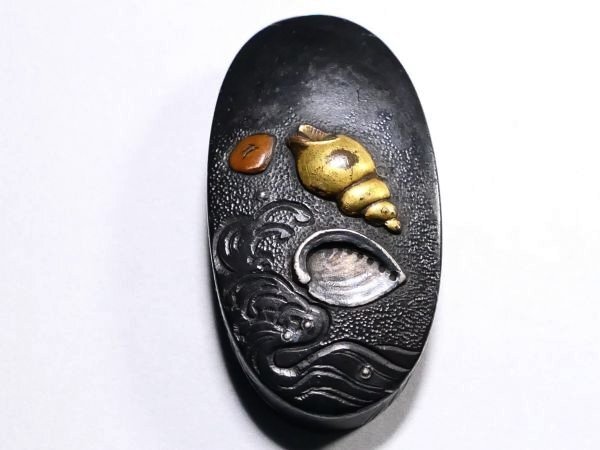 | 商品説明 | 力強き毛彫・片切彫による 迫力ある荒波細工に加え 見栄え良き貝群図の施された 拵え栄えする一品です。 作行から見て 後藤系統の優品と推測しております。 詳しくは画像にてご確認下さい。 お好きな方、 この機会に是非手に入れて下さい。 【赤銅:上質】 【見応えある荒波図】 【拵え栄えする一品】 寸法: (縁) 約 3.79cm × 約 2.25cm × 約 1.18cm (厚み) (頭) 約 2.90cm × 約 1.30cm × 約 0.13cm (厚み) 時代: 江戸時代 材質: 赤銅地 桐箱付 銘 : 無銘 状態:状態は全体的に見て概ね良好です。 多少の色絵のはがれくらいはございますが 大きく観賞を損なうことは無く、大変見栄え良き作品です。 画像にてご判断下さい。 :その他、許容範囲内の時代傷みはご理解下さい。 |