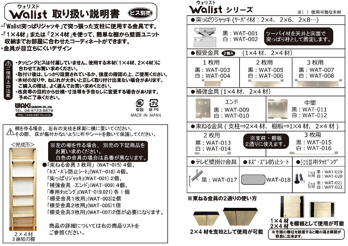 「和気産業 Walist ウォリスト DIY 壁面収納 突っ張り 棚受金具 3枚用 白 WAT-008 2個入」▼4903757306653▼(商品説明)棚受金具 3枚用・白 3枚用 WAT-008・・Size:3枚用Color:白・ブランド:和気産業・製品型番:WAT-008・カラー:白・重量:499g・材質:鉄説明 商品紹介 「1X4」材または「2X4」材を3枚使用する棚受です 「Walist 突っぱりジャッキ」で突っ張った支柱に使用する金具です 「1X4材」または「2X4材」を使って、簡単な棚から壁面ユニット収納までお部屋に合わせたコーディネートができます 金具が目立ちにくいデザイン タッピングビスは別売りです ご注意(免責)>必ずお読みください ●使用説明書を良くお読みの上ご使用ください。●本製品を使用して発生した破損や事故、トラブルについては一切責任を負いませんので予めご了承の上ご使用ください。