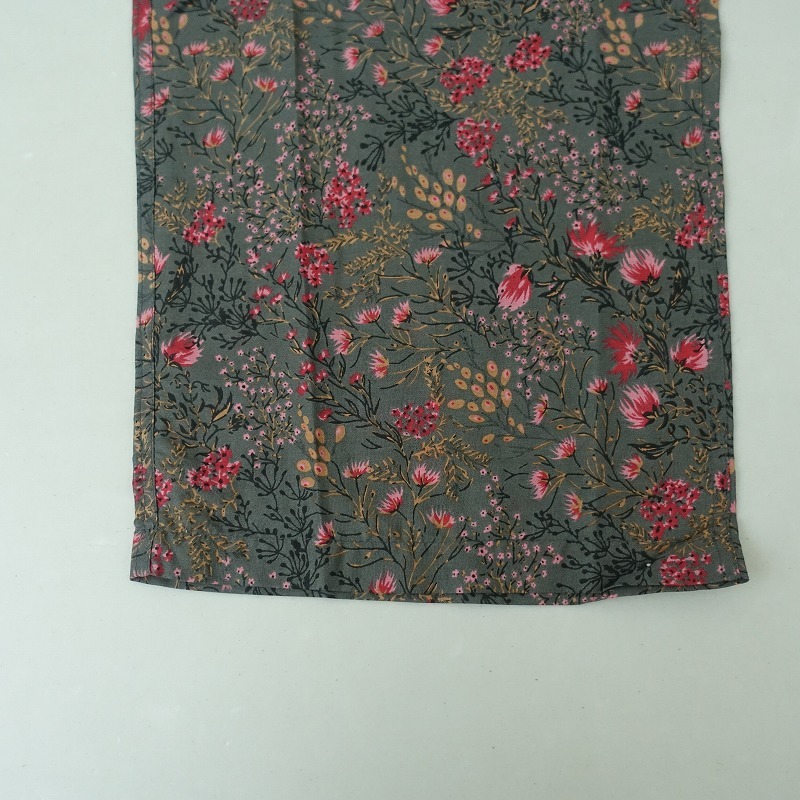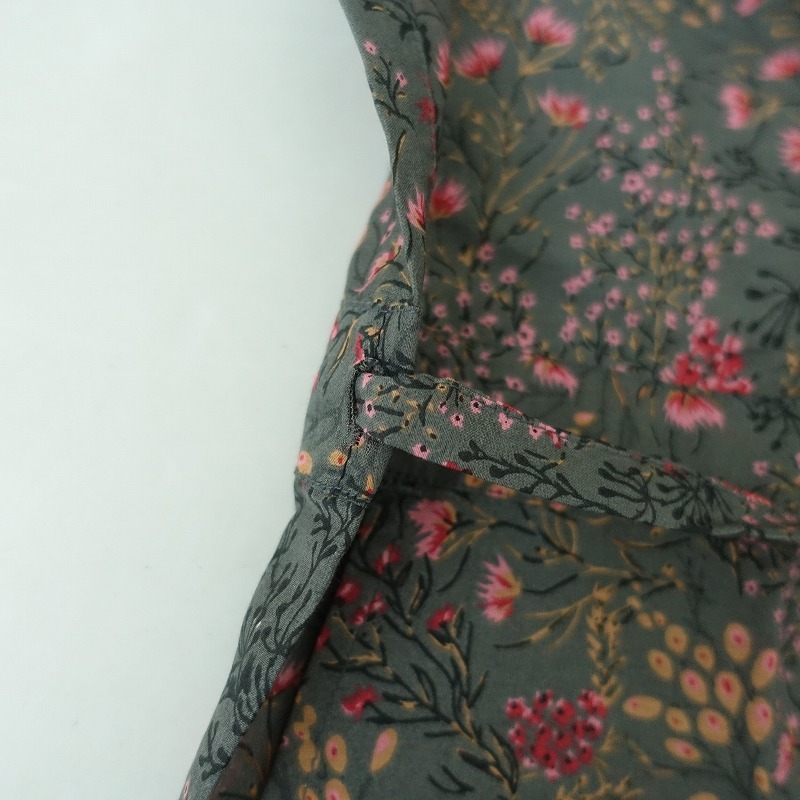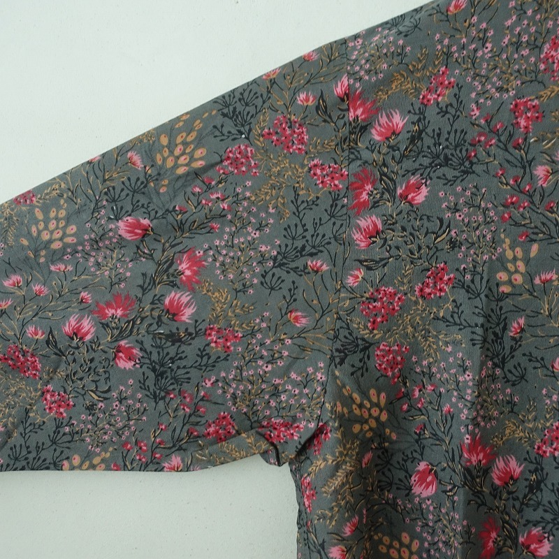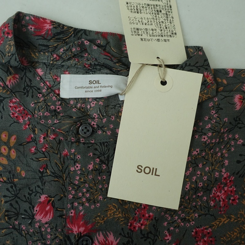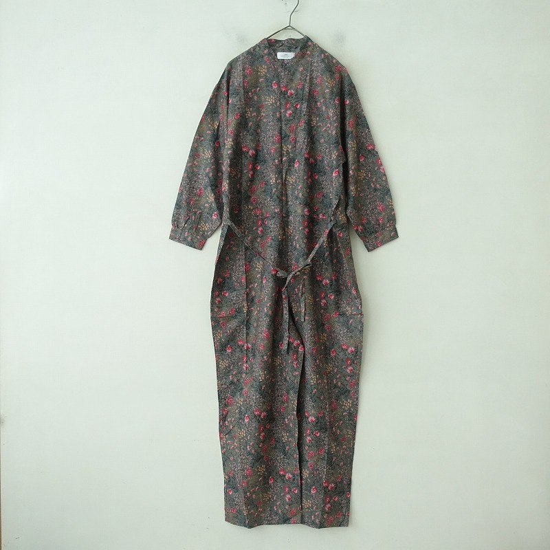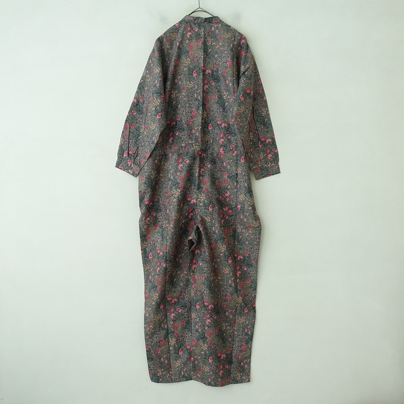 | soilのコットンシルクフラワープリントバンドカラーオーバーオールです。カラーはダークグレーベースにピンク・レッド・ベージュ・ブラックなどのフラワープリントで、綿絹混紡の薄手の布帛地です。フロント&袖口ボタンで着脱でき、後ろ腰に紐が通っております。前腰左右&右ヒップにポケットがあり、裏地は付いておりません。定価(メーカー希望小売価格)24,200円の商品です。 |