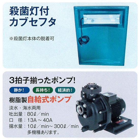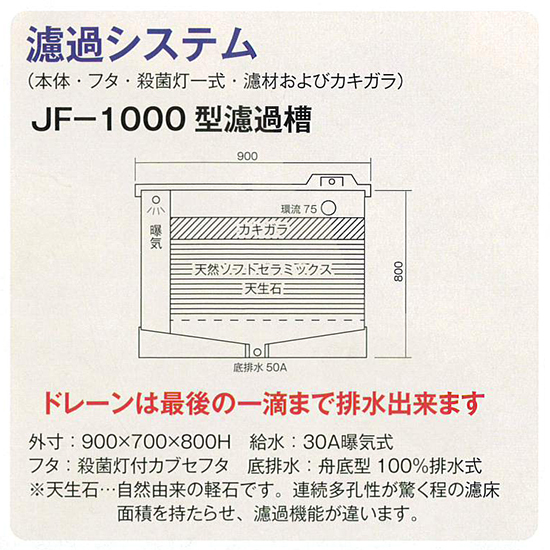 | 標準装備 | 濾過槽本体・フタ 殺菌灯15W1灯式 排水用バルブ 50A 濾材 セラミックス濾材・カキガラ 還流パイプ 75φ一式 給水用バルブ 30A×2 ポンプ 三相電機 PSPZ 100V使用 鉄アングル架台、亜鉛メッキ(ドブヅケ) 900×700×550H(mm) |
