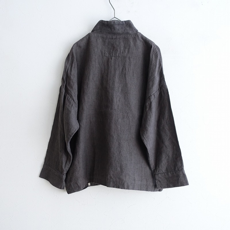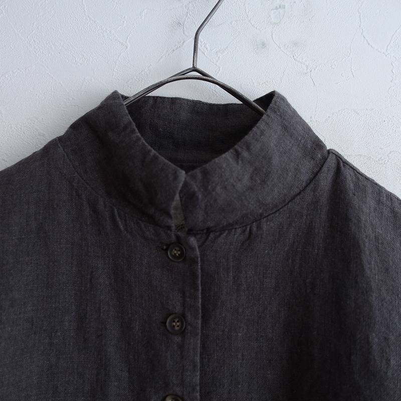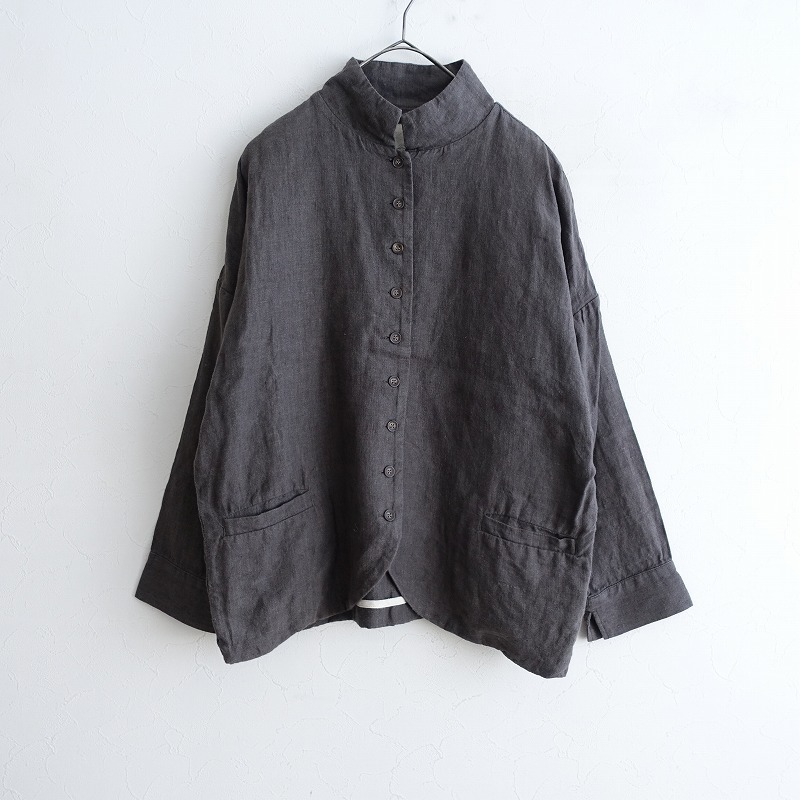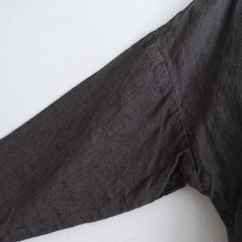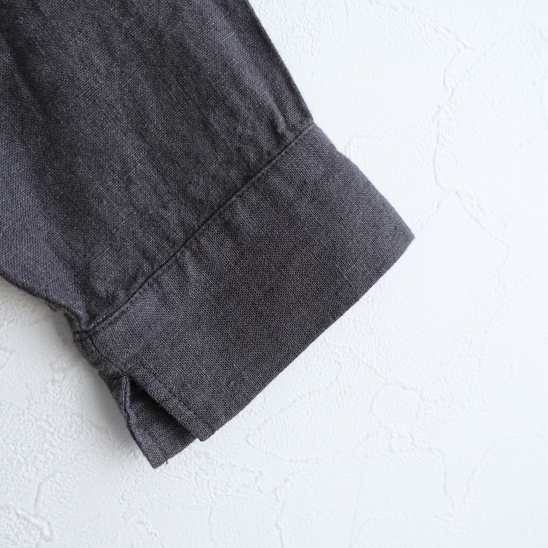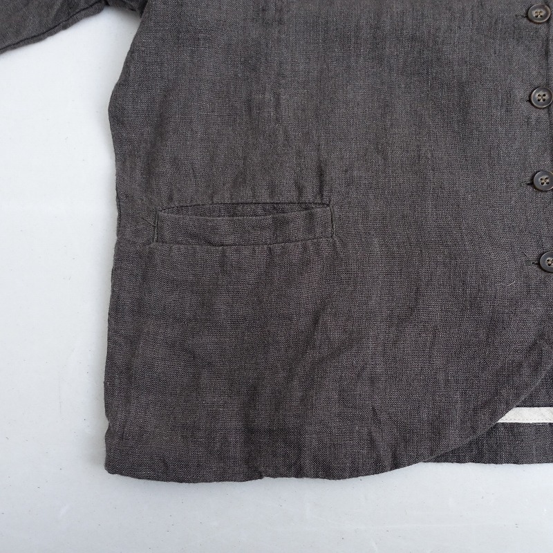 | 08 Mabのリネンステンカラー9ボタンジャケットです。カラーはくすみチャコールグレーです。程よい厚みの麻平織り生地を使用。透け感はなく、麻特有の糸節・ネップ・染ムラなどが見受けられるナチュラルな素材です。フロントに並んだ9個のボタンがポイントです。肩が落ちたドロップショルダー仕様。袖口はスリット入り。前両腰にポケットがございます。パイピングの縫い代始末で、ロックミシンを使わない耐久性のある丁寧な仕立ての商品です。 |
