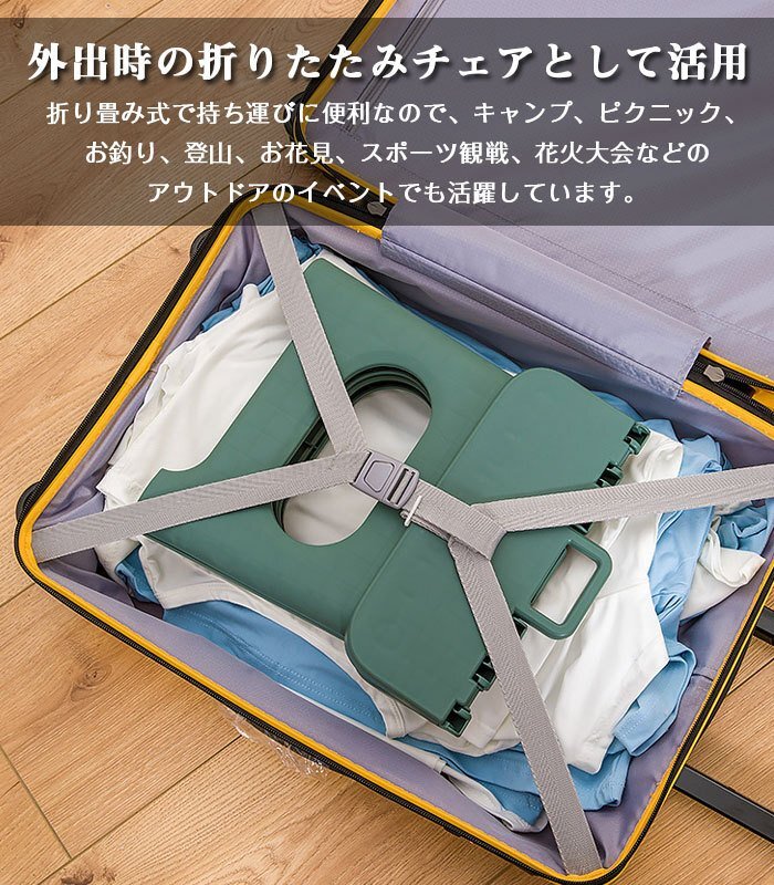 外出時の折りたたみチェアとして活用 : 折り畳み式で持ち運びに便利なので、キャンプ、ピクニック、お釣り、登山、お花見、スポーツ観戦、花火大会などのアウトドアのイベントでも活躍しています。