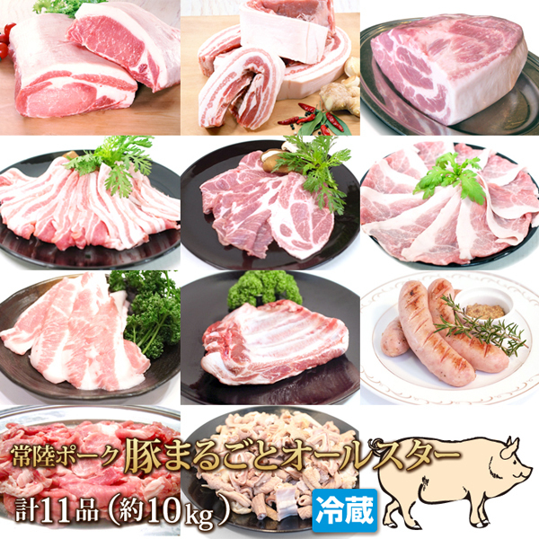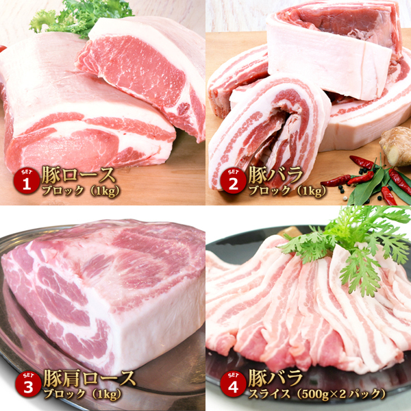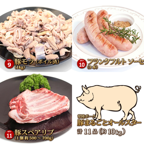 豚1頭の精肉をまるごと約10kg、のセット品です。 《セット内容》 ・ロースブロック1kg ・肩ロースブロック1kg ・肩ローススライス500g*2パック ・ももスライス500g*2パック ・バラブロック1kg ・バラスライス500g*2パック ・小間肉1kg ・豚トロ500g ・豚モツ(ボイル)1kg ・でかでかフランク3本 ・スペアリブ1枚 ◎各部位はそれぞれ真空パック済みのため、お受取後の処理がカンタンです。 |