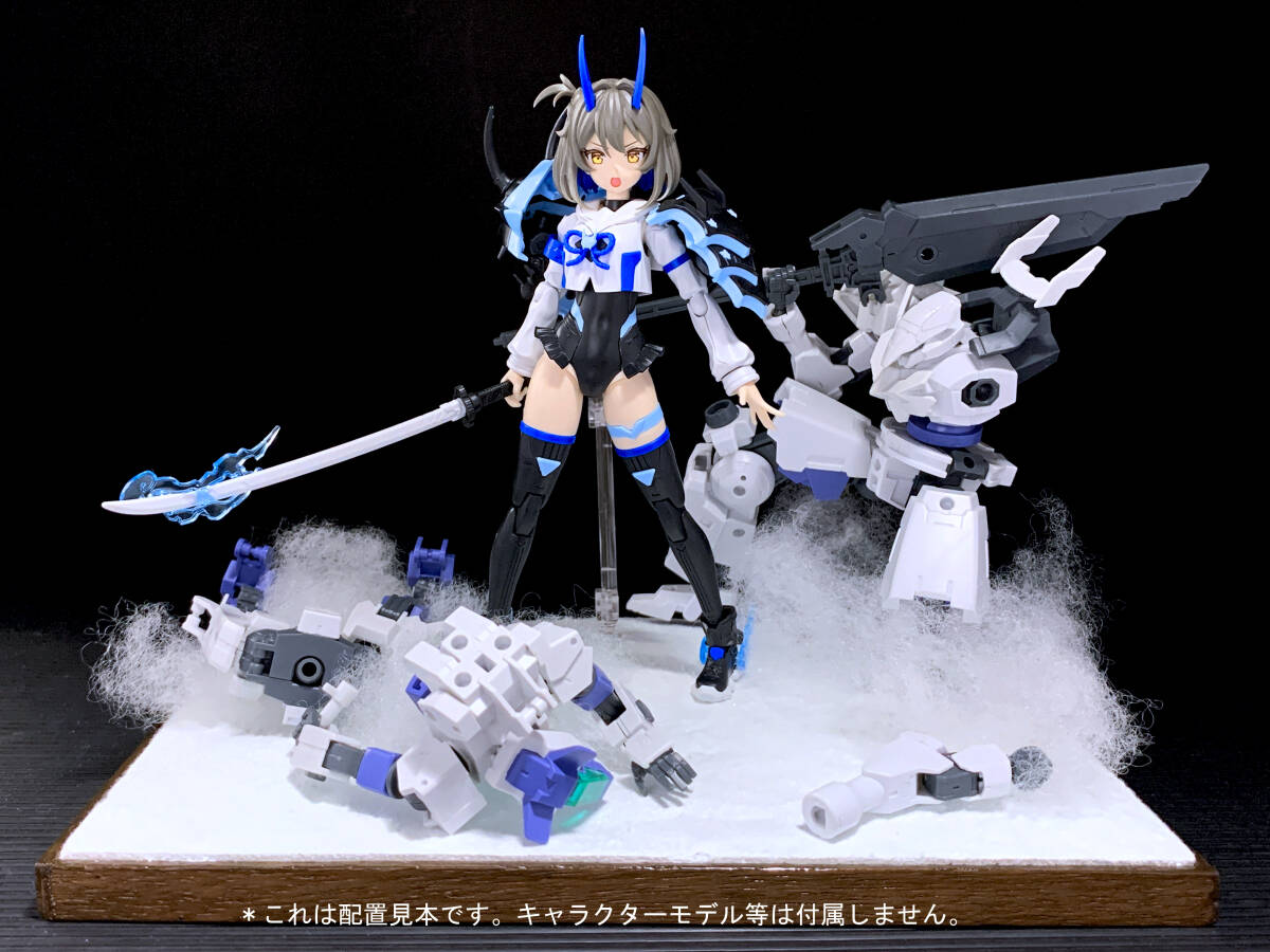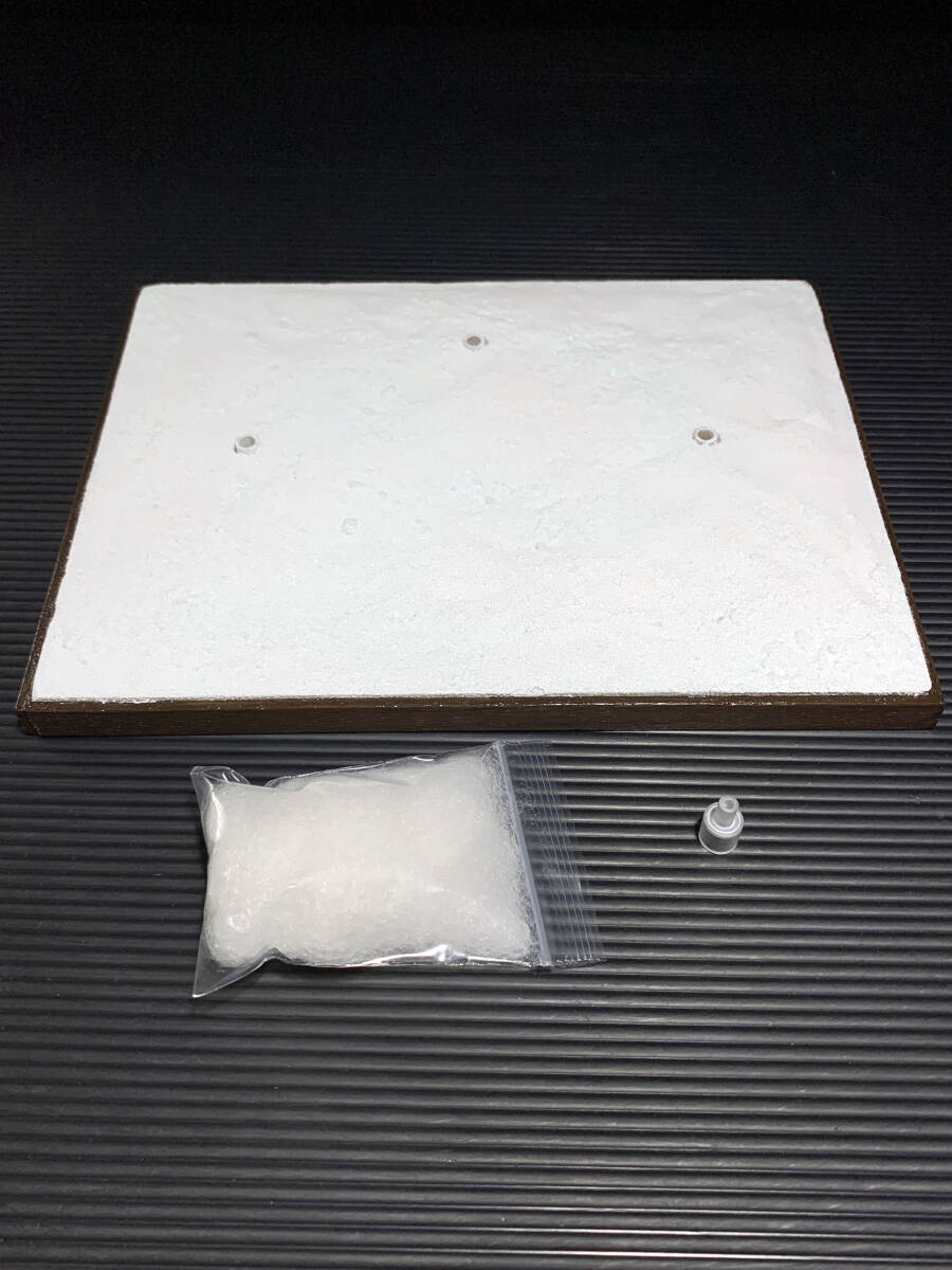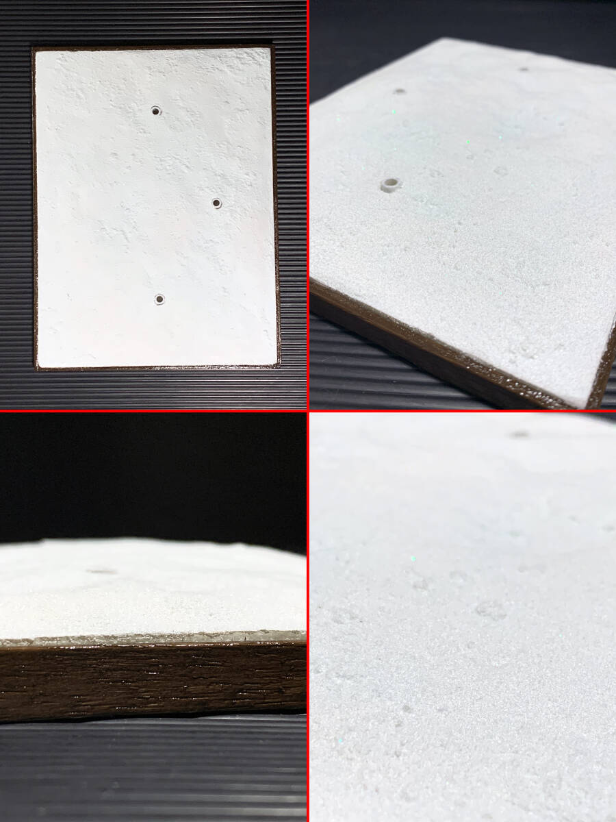 :題名の通り雪原をイメージして制作しています。僅かな起伏や凹凸を再現していますが、撮影機器や白い色ということもあり、画像の写りがどうしても微妙になりがちです。 :ジオラマ3箇所に4mm支柱支持具を設置しています。市販の可動支柱を使用することにより、フィギュア等を安定して飾ることが可能です。 :支柱支持具は4mm穴を採用していますが、付属のアタッチメントを使用することにより、6mm径の支柱も使用可能としています。 4mm径はバンダイ製アクションベース6/7、グッドスマイルカンパニーのTHEシンプルスタンドなど。 6mm径はコトブキヤ製のプラモデルなどに付属する支柱類がご利用可能です。 :上記の通り、4→6mm変換アタッチメントが1つ付属しています。 :また雪を跳ね上げた際に起こる「雪しぶき」再現のためのワタも付属します。 *画像に写っているキャラクターモデルは見本です。本商品には付属しません。 また一点物のハンドメイド品ですので、商品の状態は未使用を選択しています。 |