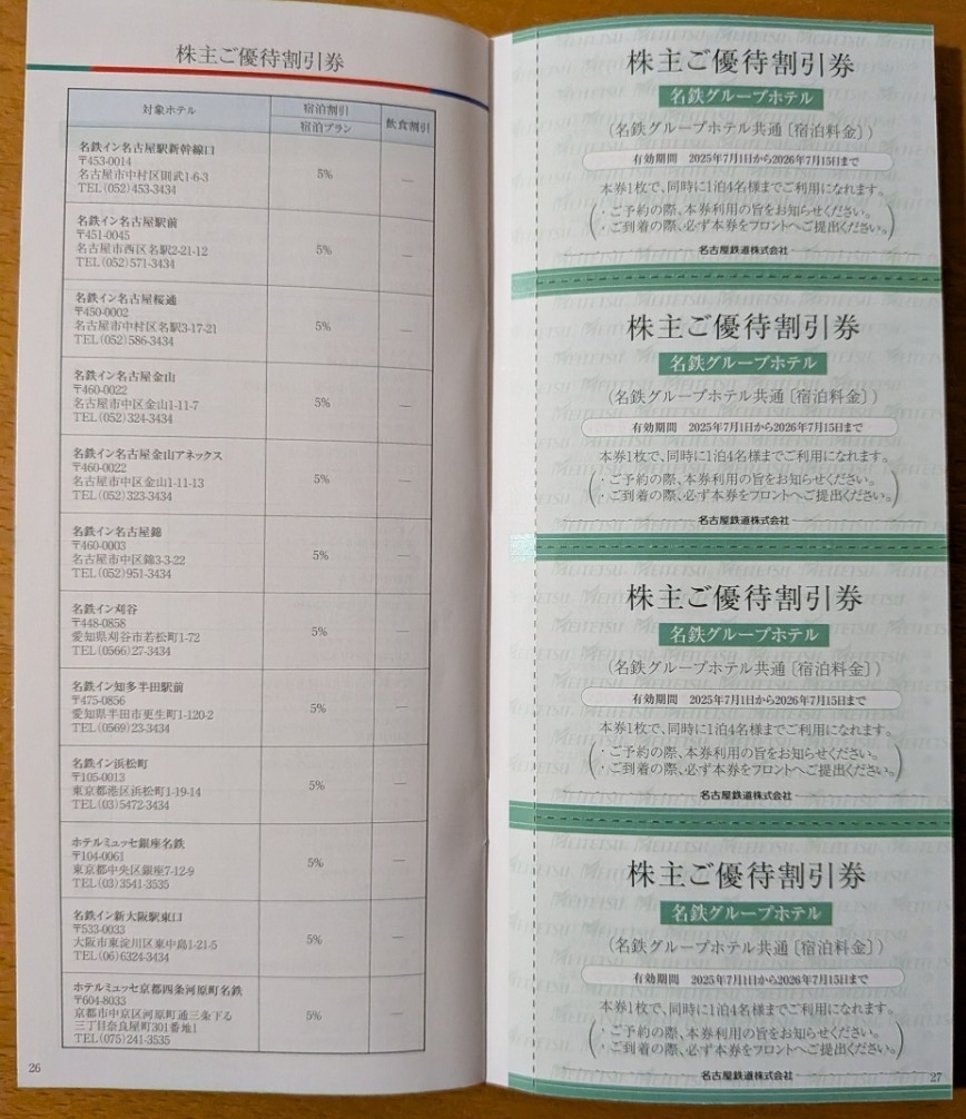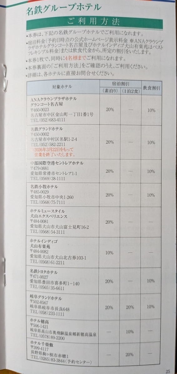 名鉄株主優待の名鉄グループホテル 宿泊料金優待割引券1枚です(4枚出品)| 出价者 | 信用 | 价格 | 时间 |