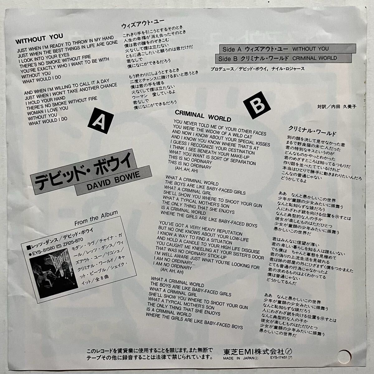 デビッド・ボウイ「ウィズアウト・ユー」の貴重な国内見本盤7インチになります (1983年 東芝EMI EYS-17451)。| 出价者 | 信用 | 价格 | 时间 |