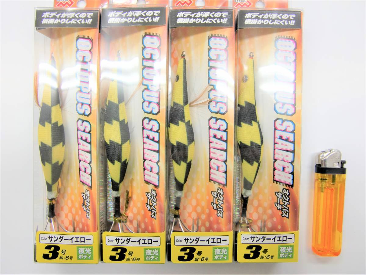 | 商品説明 | 新品のオクトパスサーチ3号(鉛6号) 4個セットになります。 セット内容 サンダーイエロー 4個 ライターは大きさを比較する為に使用した物で付属はしません。 詳しくは画像を参考にして入札して頂く様お願い致します。 夜光ボディ 遠くにキャストしてターゲット(タコ)を幅広くサーチ可能!! ボディが浮くので根掛かりしにくい! 鉛6号 ボディに鉛は付いてません |
