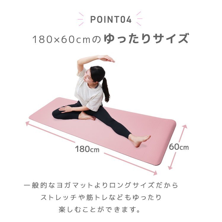 優れたクッション性を持ち、高耐久なNBR素材を使用。 関節や骨への負担を軽減し快適なヨガ時間をサポートします! 特殊エンボス加工により滑りにくく、ポーズ中の安定感が抜群! 湿気や汗をかいても滑りにくいため、安心して集中してヨガに取り組めます。 また、水に強い素材なのでタオルで拭くだけでお手入OK♪ \その他、おすすめポイント/ ・床からのひんやり感をカット ・床や畳の保護、騒音対策に◎ ・ロングサイズでゆったりストレッチできる ・オリジナルロゴ入り 軽くて持ち歩きしやすい専用のメッシュバッグ付き♪ これによりスタジオやアウトドア等、何処でも気軽にヨガを楽しめます! 【商品詳細】 サイズ:(約)180×60cm 厚さ:(約)10mm 重量:(約)1.2kg カラー:ハニーミルクティ 素材:NBR (ニトリルゴム) 付属品:メッシュバッグ、ゴムバンド (ヨガ ホットヨガ ピテラス ストレッチ トレーシーメソッド 10mm 人気 おすすめ WEIMALL) |