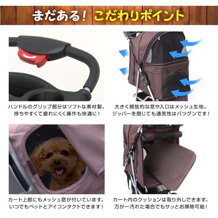 愛犬・愛猫のお散歩に便利なペット用カートです。 メッシュ付きで通気性も良く、虫なども入りにくくなります。 出入り口が2か所あります。 上部にも小窓があるので、カート押しながら中のわんちゃんの様子が確認できます♪ ハンドル部分にはドリンクホルダーと小物入れ付き! 下のカゴに荷物が入ります。 前の車輪は360度回転するので、方向転換もスムーズです。 中に飛び出し防止用のリードベルト2本付き。 コンパクトに折りたためるので、収納に便利! 【商品仕様】 カラー:ベージュ サイズ ・本体サイズ(約):幅45cm×奥行78cm×高さ98cm ・居住スペース(約):幅32cm×奥行56cm×高さ41cm ・下かご(約):幅27cm×奥行30cm×高さ26cm/17cm ・折り畳み時(約):幅45cm×奥行90cm 重量(約):5kg 耐荷重(約):10kg 材質:スチール/300Dオックスフォードポリエステル |