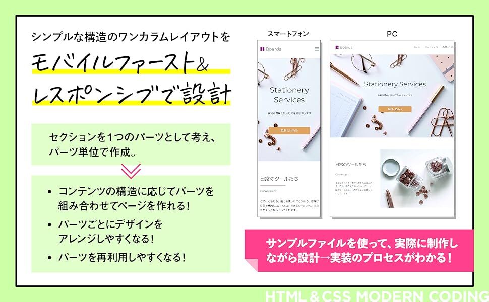 モバイルファースト&レスポンシブのサイトを、パーツ単位で「作りながら」学ぶ実践書です。