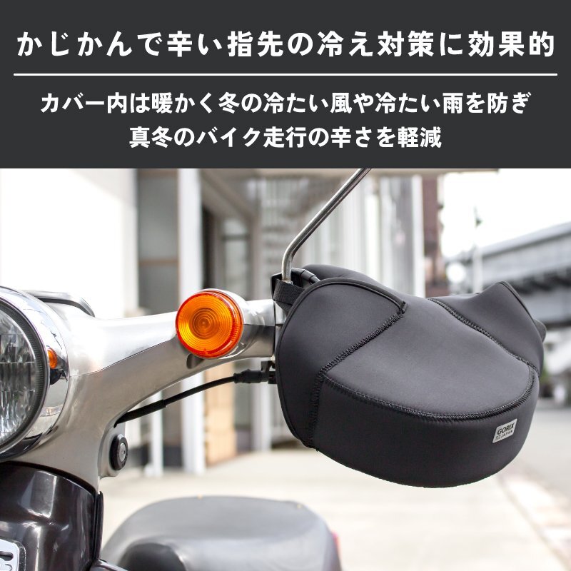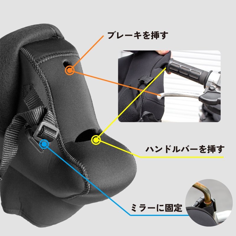バイクを乗るとかじかんで辛い指先の冷え、手の冷えがすごい気になる方におすすめのハンドルカバー。 ハンドルカバーを取付ける事でハンドルの中は[ぽかぽか暖かく]辛かった日々にお別れです。 厚手のネオプレーン製は防風、防水に優れておりハンドルカバー内を快適にします。 また伸縮性と耐摩擦性に優れていて扱いやすい。 冬の季節の冷たい風や急な雨を防ぎ暖かく快適にバイクで走行できます。 袖口も広く出し入れも簡易。 様々なバイクに使用可能。ミニバイク、スクーター、ビックバイクまで幅広い車種の対応 車輌・仕様等により取付には加工が必要な場合や使用できない場合がございます。 [防寒対策] かじかんで辛い指先の冷えに対策に効果的。ハンドルカバーを取付ける事でハンドルの中は[暖かく] 冬の冷たい風や冷たい雨を防ぎます。 寒い季節でも指先暖かく快適にバイクに乗る事が可能に。 [厚手のネオプレーン素材] [ネオプレーン]耐摩耗性、耐水性・耐候性と耐寒性、クッション性等の様々な要素で優れている素材です。 ウェットスーツにも使用されるネオプレーン素材。 合成ゴム素材の一つで強度保ちながら耐熱性と耐寒性に優れているので冬の防寒カバーに最適な素材です。 [保温性抜群] 裏地は柔らかな肌触りを持ち保温性と快適性を促進する生地です。適度な厚さで、寒い季節でも指先暖かくて快適に。 [防風防水] 冷たい風もハンドルカバーを装着する事で遮断できます。 表面は防水性能を備えた生地ので、雪が降る時も使用可能です。(※完全防水ではありません) [夜間安全反射] 暗闇でライト等の光をを反射して存在をアピールします。 視認性が良くなり夜間の安全性を向上します。 [簡単装着] ハンドルカバーの装着はとても簡単で装着・脱着をスムーズに行えます。 [様々なバイクに使用可能] ミニバイク、スクーター、ビックバイクまで幅広い車種の対応。 車輌・仕様等により取付には加工が必要な場合や使用できない場合がございます。 商品内容バイク用ハンドルカバー 生地ネオプレイン、SBR、裏地フリース サイズ幅24 x長さ22 cm(誤差値±2cm) 仕様裏地フリース仕様、防水防風ネオプーレン ※注意事項※走行中は絶対にハンドルから手を離さないで下さい。 一度手を抜くとすぐにハンドルを握れない場合があり大変危険です。 走行中、脱落する可能性がありますのでミラー固定用ストラップがしっかり取付られているか確認して下さい。 汎用品のため、装着できない車種もございます ・商品は入荷によりキズがある場合があります。 その場合、保証対象外になりますのでご了承お願い致します。 ・ディスプレイ環境により実物と色が異なる場合が有ります。 ・入荷時期により予告無く一部仕様変更する場合が有ります。 |