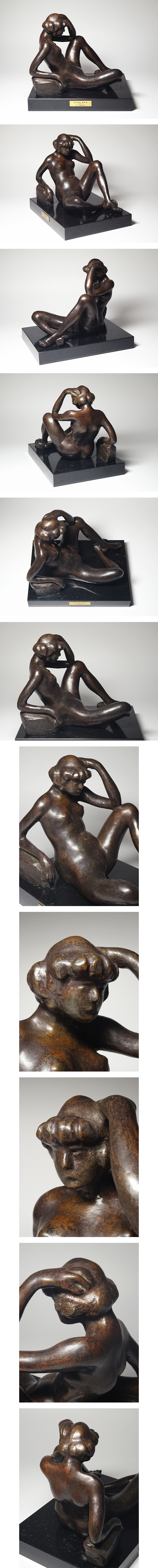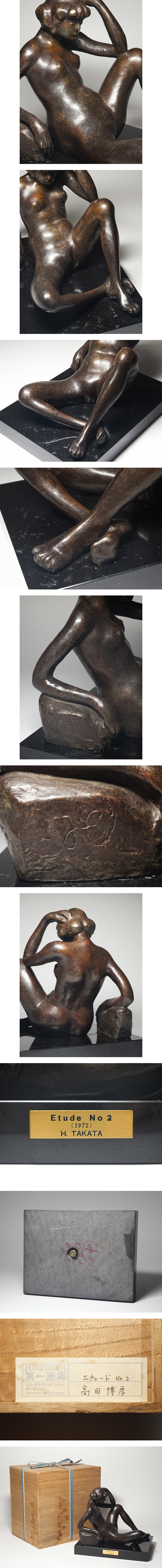 本物保証!         高村光太郎との出会いから彫刻家を志し、昭和6年(1931年)に妻子を残し単身渡仏。  ロダンやマイヨールら巨匠彫刻家の影響を受けると共に、ロマン・ロランやアラン(エミール=オーギュスト・シャルティエ)、ルオーら一流思想家や芸術家らと交流を持ちながら創作活動を行い、昭和32年(1957年)に帰国。  帰国後は鎌倉にアトリエを構えて創作活動を続けた戦後の具象彫刻を代表する彫刻家【高田博厚】(1900-1987)作。   ブロンズ製の裸婦像『Etude No.2』です。   1972年に発表された作品です。         妖艶な表情を浮かべる裸婦の奔放な姿が表現された秀逸作品。         作品プレートが付いたオリジナルの大理石台座付き。   岩手県盛岡市にあった「MORIOKA第一画廊」にて販売された作品で、同店が誂えた桐箱付き。         総じて目立つような傷みは無くとても良好な状態です。          正真正銘本物保証!