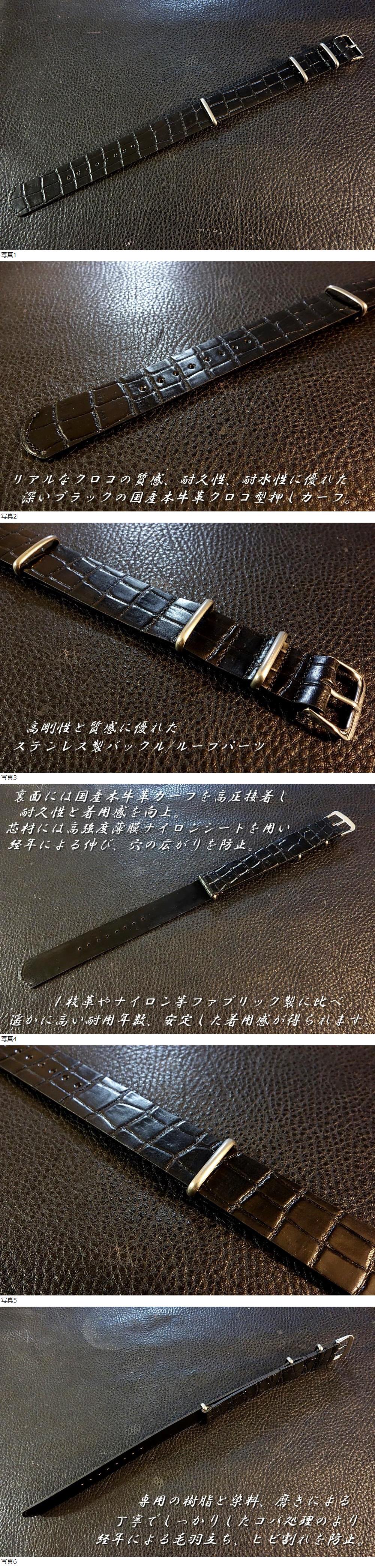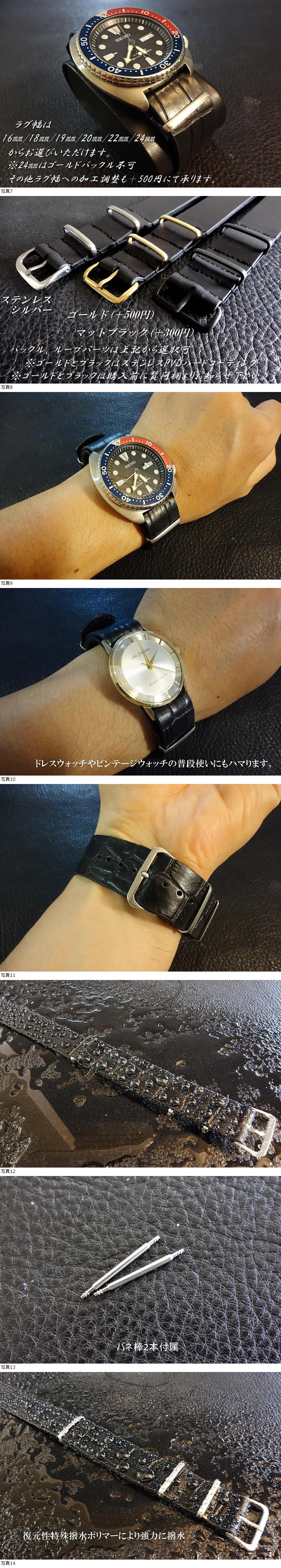 | ◆Leather NATO G10Strap◆高品質国産本牛革クロコ型押しカーフ BLACK Custom Order(ラグ幅/BUCKLE COLOR) 強力撥水 日本製 受注製作(納期10日前後) |