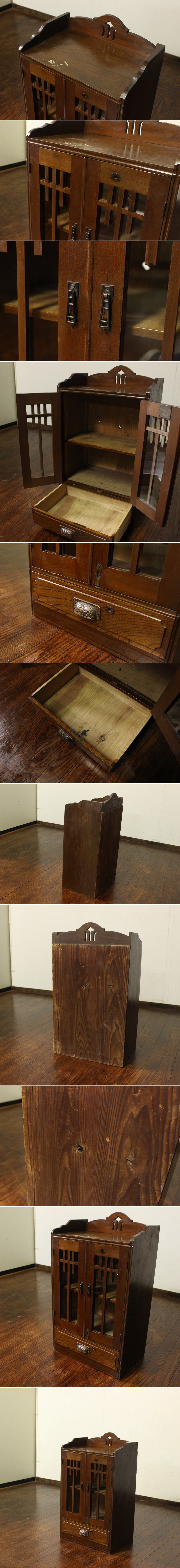 小振りな木製収納棚 扉デザインです。 卓上にもちょうどよいサイズ 下部には引出し付きです。 インテリアとしては勿論、店舗什器などにもオススメです。 |