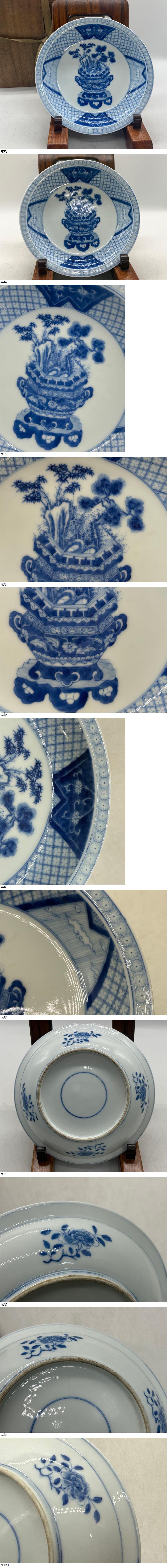 Features: 白地藍彩,中央繪博古紋樣(博古架、奇石、松竹等),邊飾幾何格紋與花卉紋,造型典雅。