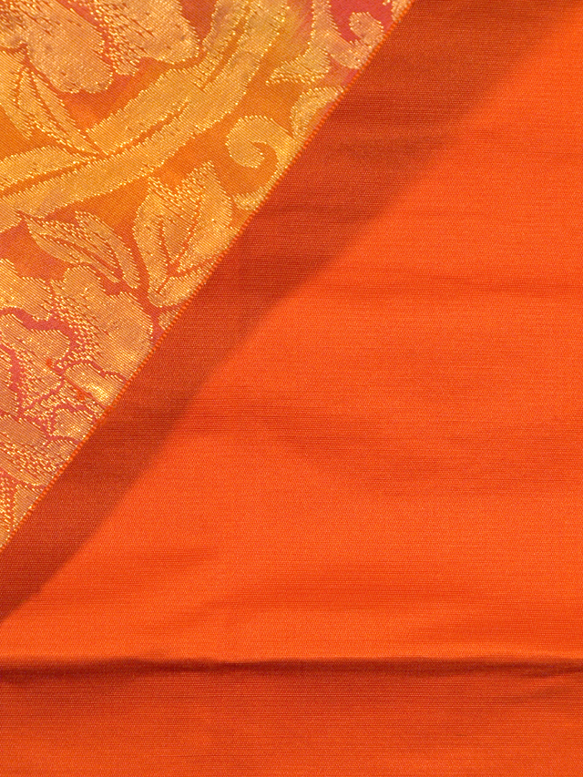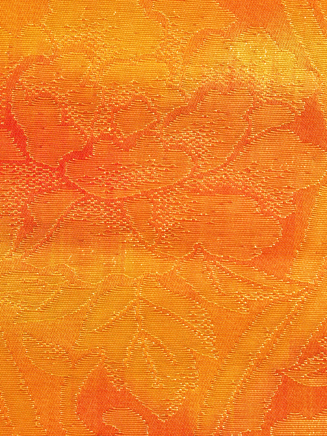 深みのあるオレンジ色に鈍い金色の文様が格調の高さを感じさせる意匠です。レリーフのような趣きの牡丹唐草も優美な印象です。