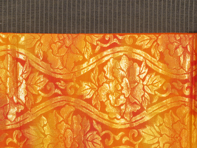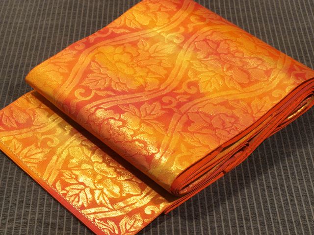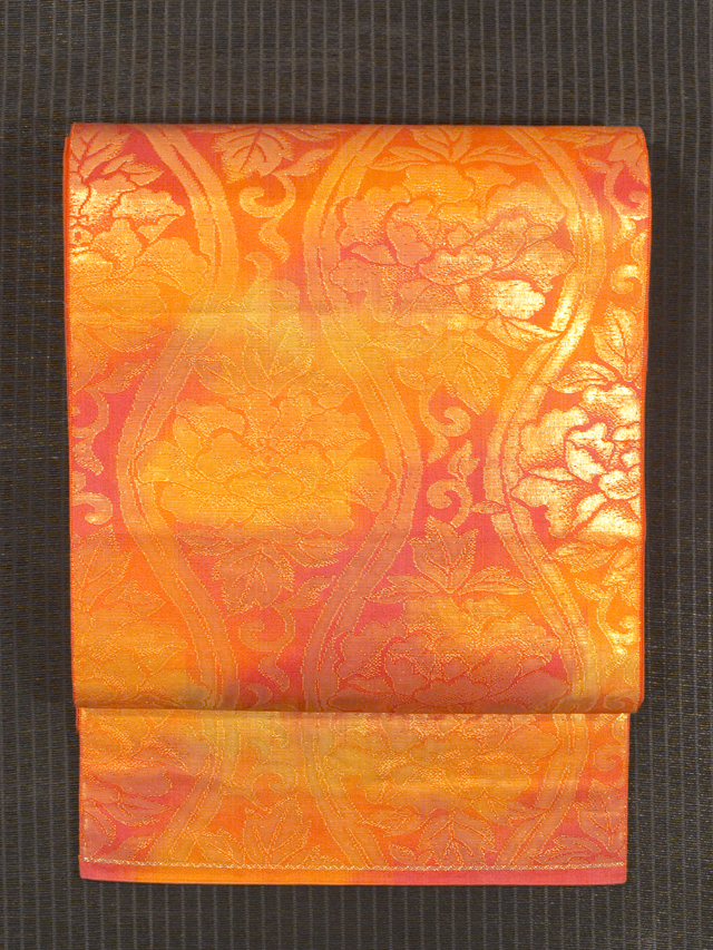 詳細  全体的な印象としては濃淡と若菜色のぼかしのある紅緋色の地に、牡丹唐草(ぼたんからくさ)の配された二重立涌(ふたえたてわく)の文様が織り込まれている西陣織の京袋帯です。