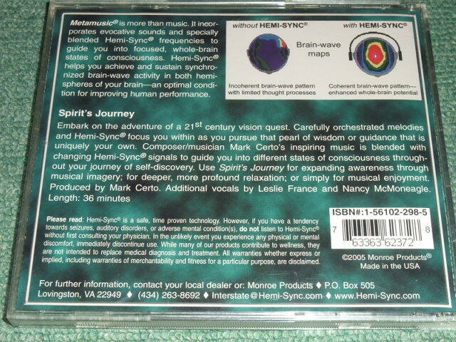 ★(1999)/MonroeProducts■◎レンタル落ちではありません。◎状態⇒ケース、ヒビ等なし。インナー解説良好、盤良好です。☆梱包はプチプチ使用の上、茶封筒に入れての発送となります。★即決★CD【Spirit's Journey [ヘミシンク]/MonroeProducts】■◇◇◇M