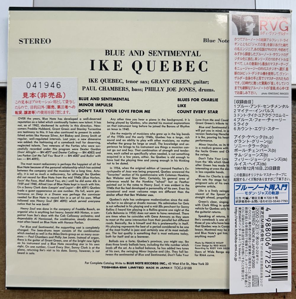 中古CD1961年12月録音盤質A帯付き 紙ジャケット サンプル盤 TOCJ-9188 アイク・ケベックIKE QUEBEC ブルー・アンド・センチメンタルBLUE NOTE RVG ※ 当店の商品は「未開封品」を含めて経年劣化のある中古品です。 「目立つ傷汚れなし」「新品」の表記でも多少のヨレや色アセがある事があります。 極美品をお探しの方のご要望には応えられない可能性がありますので、購入を控えていただきますようお願いいたします。 ※ 当店の商品は「未開封品」を含めて経年劣化のある中古品です。