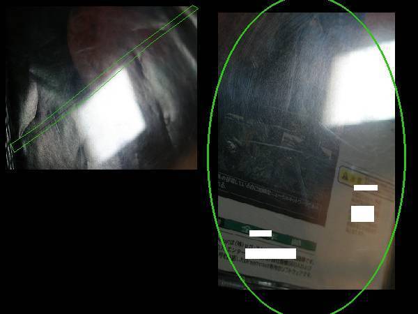 緑の丸のところ傷、汚れ、折れ、縒れ、擦り傷、割れなど