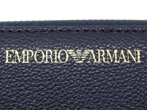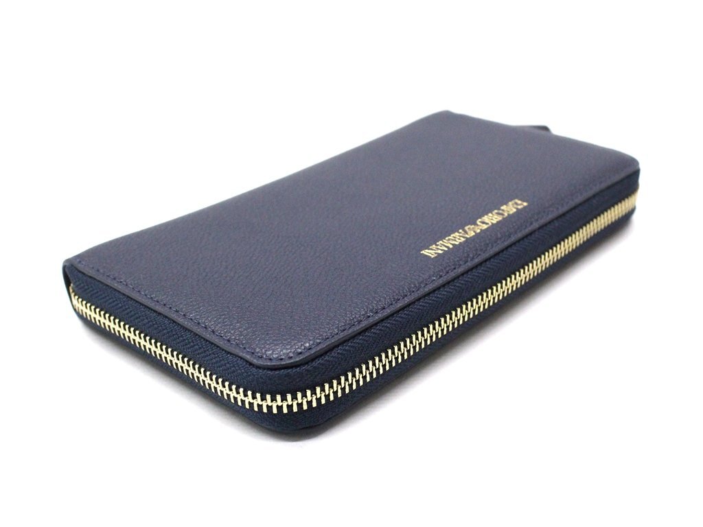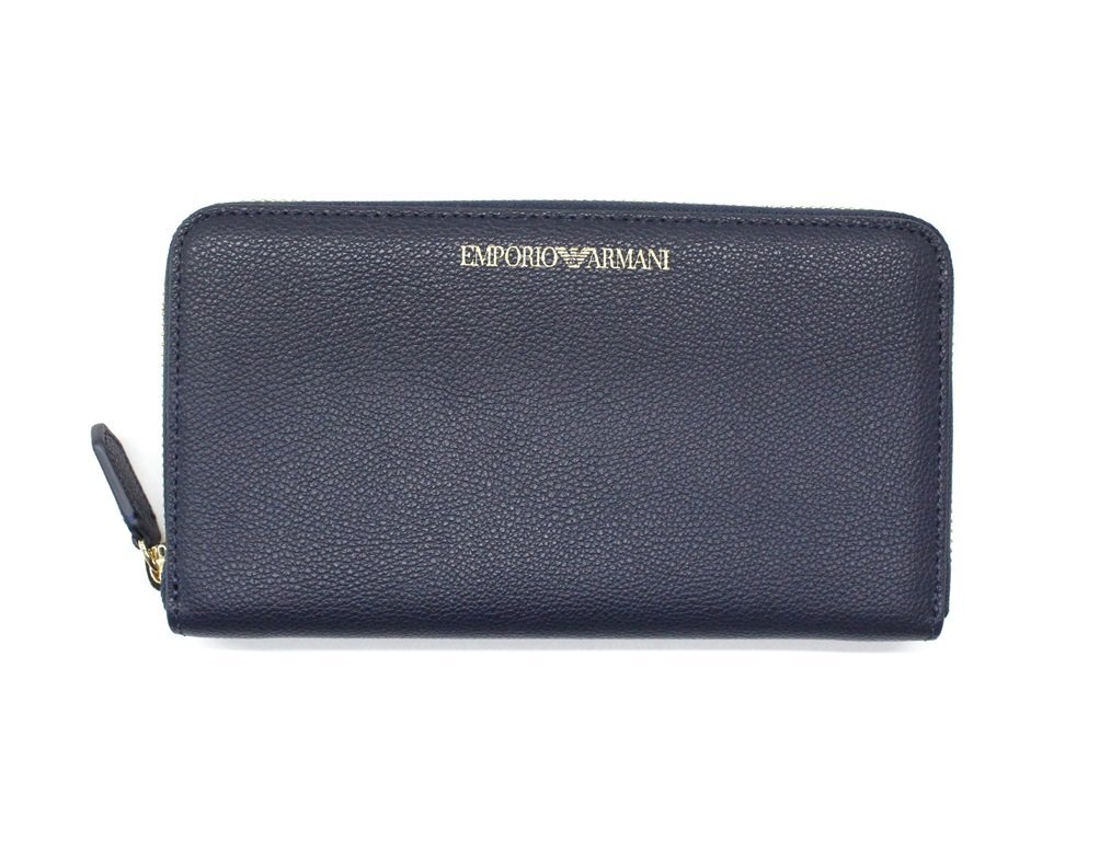 7万新品◆EMPORIO ARMANI アルマーニ 紺青ロゴ箔押しレザーラウンドジップ長財布