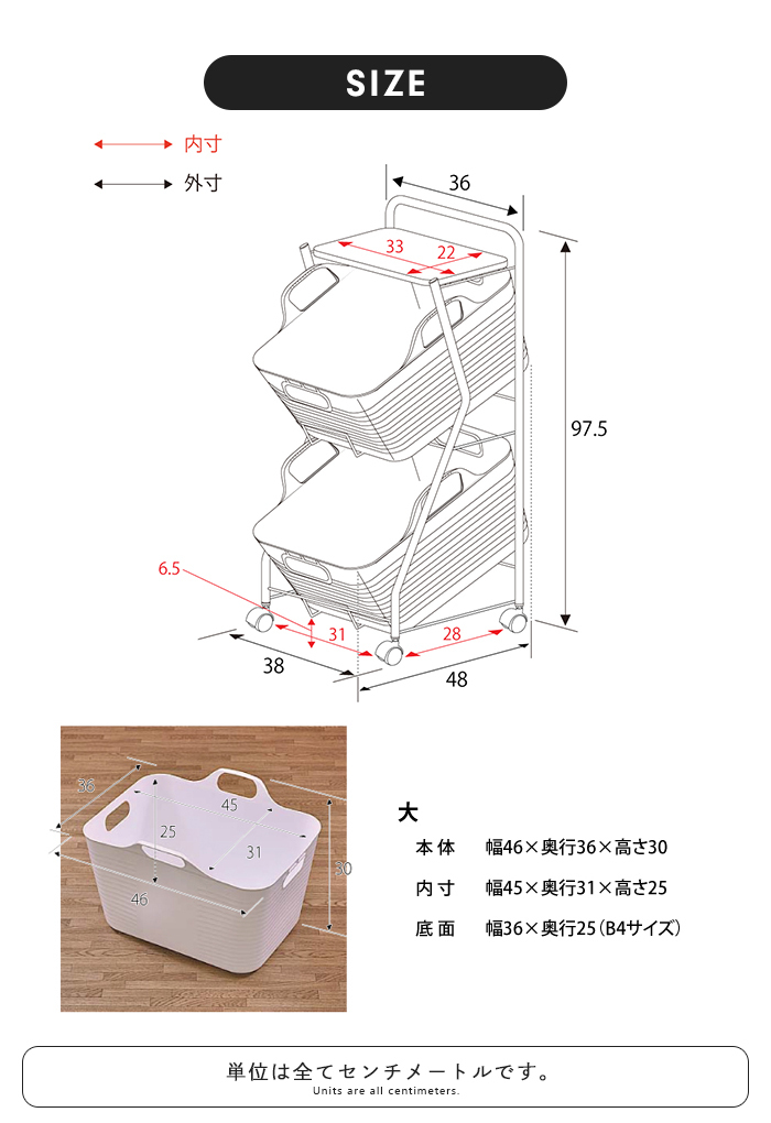 | [本体]幅38×奥行48×高さ97.5cm [バスケット]幅46×奥行32×高さ30.5cm(持ち手含む) ※一番広い口の部分のサイズです。底に向かって少しずつすぼまります。 |
