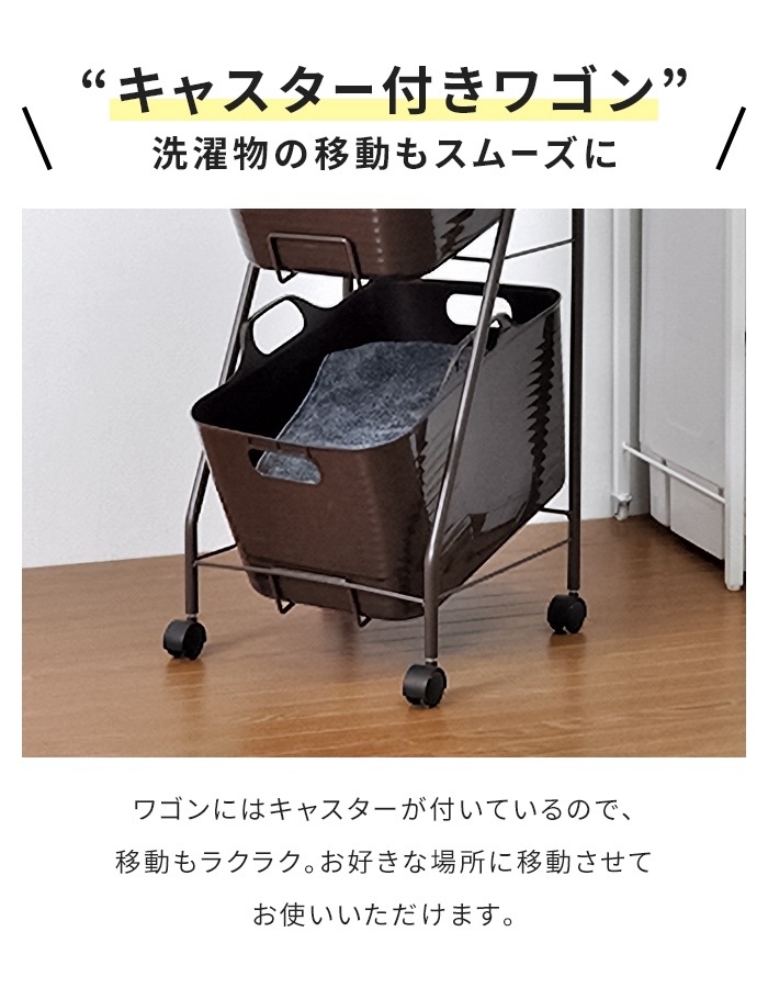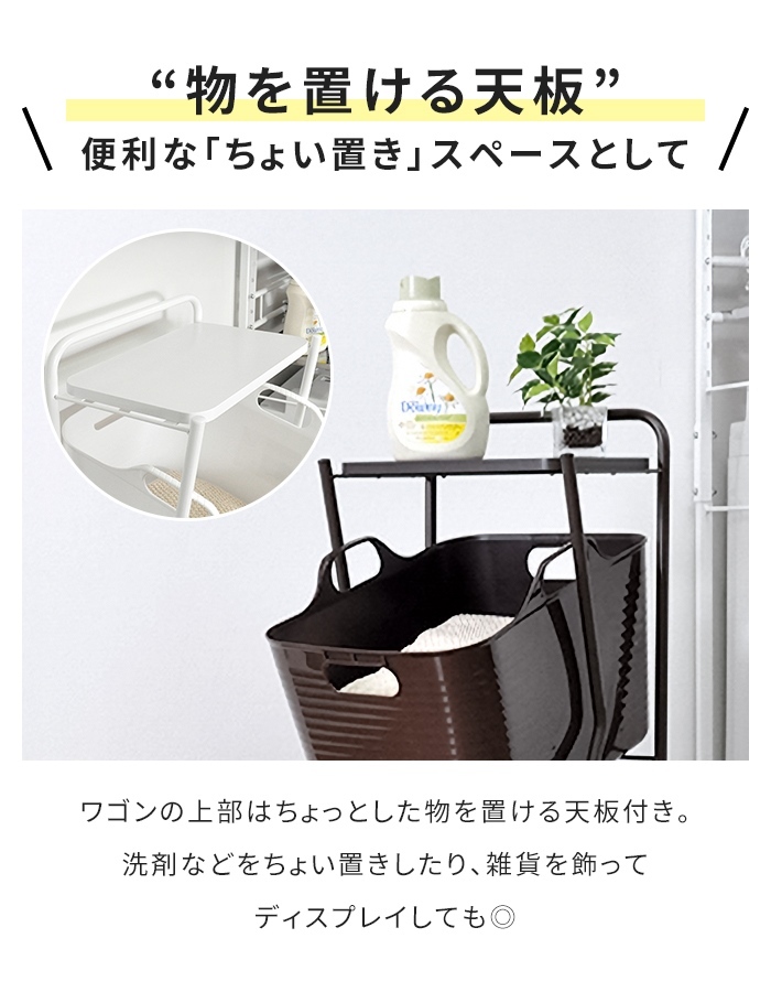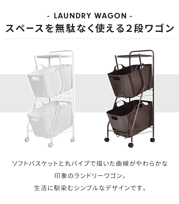 | ソフトバスケットと丸パイプで描いた曲線がやわらかな印象のランドリーワゴン。 斜め置きのため、出し入れしやすく、扱いやすいデザインになっています。 天板には洗剤や洗面周りのちょっとした小物を置くことができ便利です。 キャスターがついているため、洗濯物の移動もスムーズに。 たっぷり入るバスケットは、丸洗いもできる優れもの。 |