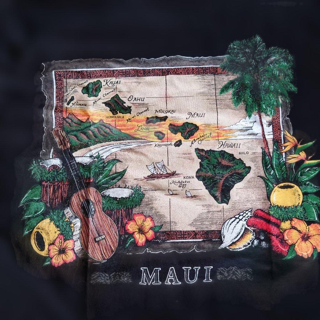 黒のMサイズ、マウイの地図と花柄デザインのTシャツ。 - ブランド: Alstyle Apparel - 色: 黒 - デザイン: マウイの地図と花柄 - サイズ: M 肩幅45 身幅46 袖丈20 着丈70 単位cm ご覧いただきありがとうございます。