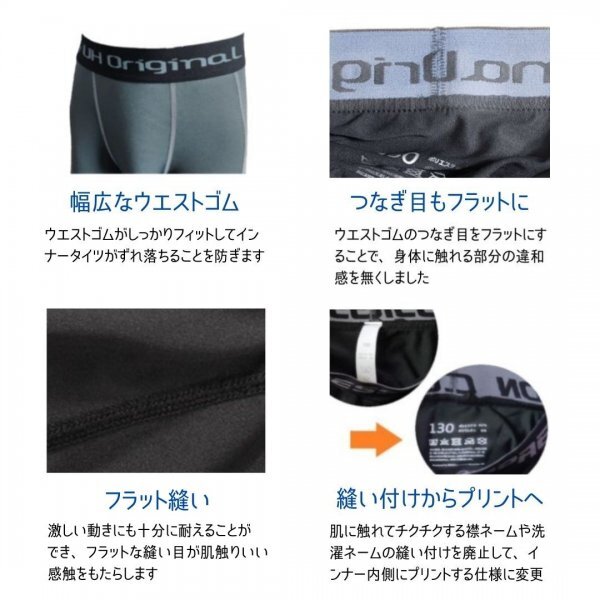 | 着替えも恥ずかしくない! ぴったりフィットでもサラサラでインナーが気にならない! お子様のスポーツや部活動に最適な 「ユーエイチオリジナル」のスポーツインナー。日本国内でデザイン・監修された高品質なジュニア用スポーツインナーです。 サッカー、野球、陸上、ランニングなど、あらゆるスポーツに対応したコンプレッションインナーとしてお子様のスポーツやトレーニングに力を発揮!筋力をサポートしてパフォーマンスを上げ、 筋損傷の回復効果があることを確認した研究から疲労回復効果もあります。 「ユーエイチオリジナル」ブランドの製品は日本国内の品質評価機構にて検査合格を取得。紫外線防止指数の測定値はUPF50+、紫外線遮蔽率は99.8%で、お子様の日焼け防止効果も抜群です。 吸汗速乾なスポーツインナーシャツは長時間のスポーツでも快適に過ごすことができます。ハイマルチフィラメント糸を使用した生地は柔らかな肌触りで、夏冬問わずオールシーズンに対応! ウエストゴムがしっかりフィットしてユニフォームの下に着用してもスパッツがずれ落ちることを防ぎます。 4方向に伸びるストレッチ素材のため、着るのも脱ぐのもカンタンで、ピッタリフィットでも動きやすく、日常的に通学用や日焼け防止、防寒用のレギンスとしても使えます。 キッズからジュニアサイズまで対応(120~170cm)。小学生から中学生、高校生まで幅広い年代に対応。成長期の子どもたちにフィットするサイズ展開です。 野球、サッカー、フットボール、フットサル、ラグビー、陸上、テニス、バスケットボール、バドミントン、バレーボール、卓球、ソフトボール、ジョギング、ランニング、トレーニング、スキー、スノーボード、ダンス、ヨガ、フィットネス、ジム、筋トレ、登山、部活、クラブチーム、キャンプやアウトドアのベースレイヤーなど、あらゆるスポーツや日常生活に対応したキッズ・ジュニア用コンプレッションインナーがお子様のパフォーマンスを向上させます。 アンダーシャツ本体とステッチが同色のため、公式戦にも対応してます。 | ||