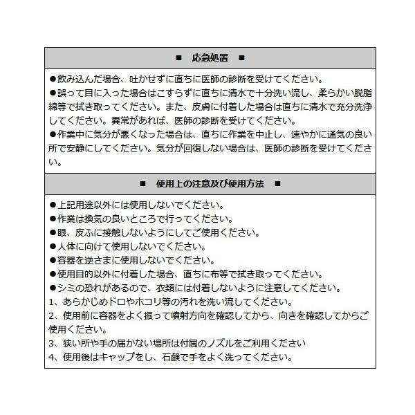 成分 石油系炭化水素、防錆潤滑剤、n-ブタン、イソブタン、噴射剤