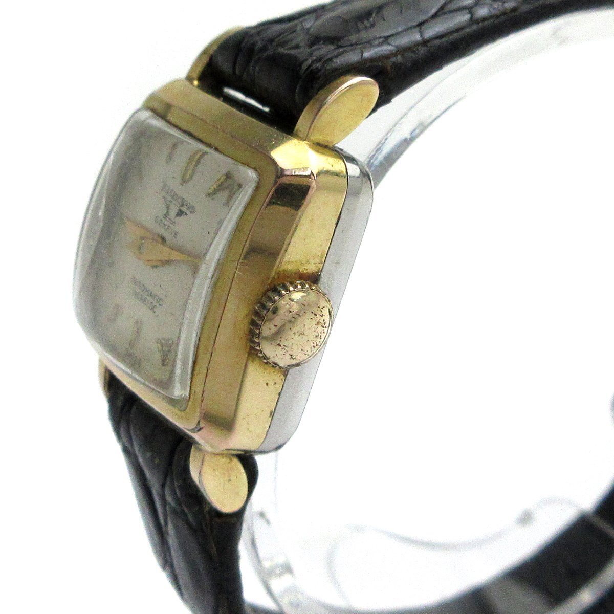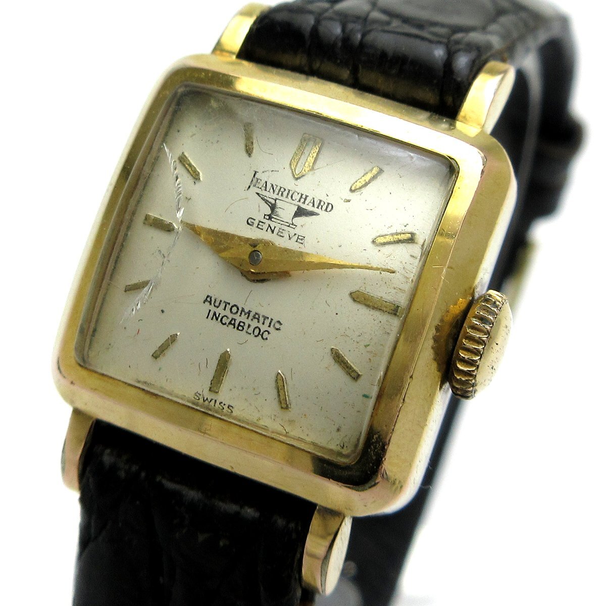 ■スイスの時計メーカー『ジャンリシャール(JEANRICHARD)』。 ■1896年アドルフ・シールド氏によって創設された『A. Schild(ア・シールド)』ムーブメントが使われています。 ■「AS cal.1477、自動巻き」。 ■ケースは角に丸みのあるクッションスクエア型。古き良き時代の丁寧な仕事がうかがえる金張り装飾。 ■ヴィンテージ品、コレクションや部品取りにおすすめ。 ◎オートマチックムーブ(A. Schild/cal.1477)。 ---【商品状態】--- ☆不動品、指針操作は可能です。 ☆外装、小キズはありますが比較的キレイです。 ☆風防にキズがあります。 ☆バンド(社外品)、使用感はありますが比較的キレイです。尾錠も社外品。 ※商品画像はお客様のモニター環境によっては色調が異なって見える場合がございますのでご了承ください。 |