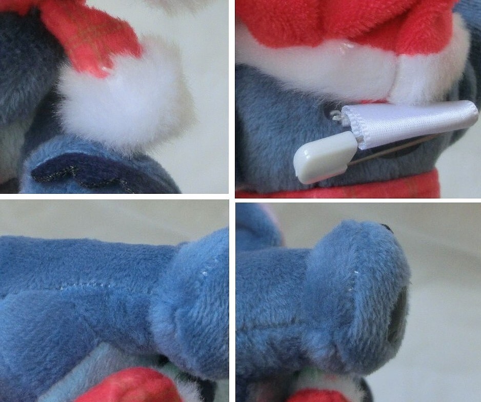 【※難あり(金具の変色等)】 ※紙のタグはプラスチックのワイヤーを切って外しています。(写真では横に置いているだけで本体から分離しています。) ご注意、ご了承下さい。 頭にボールチェーンと頭の背面に安全ピンが付いています。 大きさの目安はスティッチの足から耳までが約12,5cm スクランプはフェルト?1枚に目や口、リボン等はプリントの簡易な造りです。 現物と写真は色みが同じではないと思います。ご了承下さい。 ●状態について● ※難ありです。キーホルダーとして未使用ですが傷みがあります。 金具(ボールチェーンの留め具やボール)が変色しています。 茶色い点や線が付いてまだら状になっており見た目が悪いです。 サビやメッキ?の剥げ、傷等の可能性もあります。 ・また、安全ピンの金属が黒ずんでいたりくすんでいます。通している白い布の当たる部分(特に内側の両端)に移り少し黒くなっています。 ・スクランプの目の中の白い点のプリントがきれいな円でなくいびつです。 写真でみると白いプリントの中に小さく水色の点があり、またリボンのピンク色が線や点状に黄色くなっているところがあり、プリントが剥げている可能性があります。 ・スクランプの目や口、リボン等のプリントの周りや側面に接着剤?のはみ出しがあり茶色く変色しています。 スティッチも爪の縁等が白くなっています。 ・安全ピンのプラスチック部分に黒い点やすり傷、すれた跡が多数付いています。 ・玉止めや縫い糸が出ている箇所が複数あります。 ・スティッチの背中の模様のプリントがしわになっています。 ・刺繍や短い毛の生地全体、フェルト生地が毛羽立っています。 逆に毛並みは寝たり固くなっている可能性があります。 ・布のタグ全体の繊維が傷んでいます。 ・紙のタグ(本体から取り外し済み)は縁に近い所や破線の周り等が茶色く変色しています。 折れやしわ、ふちにめくれ、全体にすり傷、窪み、爪で押した跡のような凹んだ線の傷、すれた跡のツヤの線、汚れ等あり傷んでいます。 また、印刷の関係か黒い点が複数付いています。 ・縫製や刺繍の粗等造りのむらがあります。 ・変質や変色等の経年劣化しているかもしれません。 上記をご了承頂いた上でご入札をお願い致します。 |
