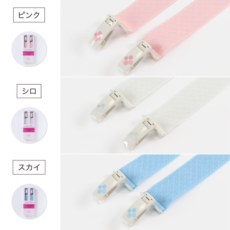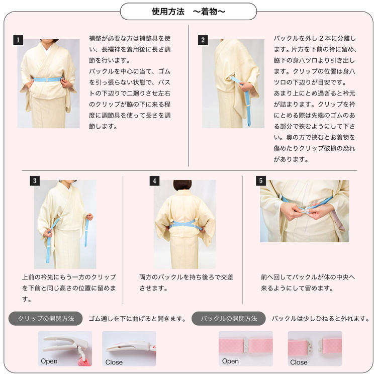 | 片手で開閉できるクリップで、着付けもスムーズに楽々♪ クリップ内側に滑り止めが付いていて衿をしっかりとキープ。 プラスチック製の留め具・バックルを使用しておりますので、結び目ができません。 着物や長襦袢にご利用頂けます。 幅広のゴムを使い体に一周させる事により着装が安定し、乱れにくく、強く締める必要がありません。 着物の衿先に留め、着装が乱れないようにする着付けの必需品です。 衿元をしっかりと固定し、胸紐としてもしっかりと締まります。 ゴムタイプですので、お出掛けやお食事の際の動きに対応し着崩れを防ぎます。 【Mサイズ】長さ(1本)42~74cm/巾3cm 【Lサイズ】長さ(1本)52~95cm/巾3cm (調節具により調節可能) 【品質】日本製 留め具・両面バックル・調整具:ポリカーボネイト100% 織ゴム:ナイロン70%・ポリエステル15%・ポリウレタン15% ゴムの長さは温度、気候により多少縮む事がございます。 ※仕様やパッケージデザインは予告なく変更になる場合がございます。予めご了承ください。 胸元を綺麗にすっきり!着物用ベルト ・採寸ですが多少の誤差はご了承ください。 ・PC環境や光の反射により商品と若干色が異なる場合がございます。 |