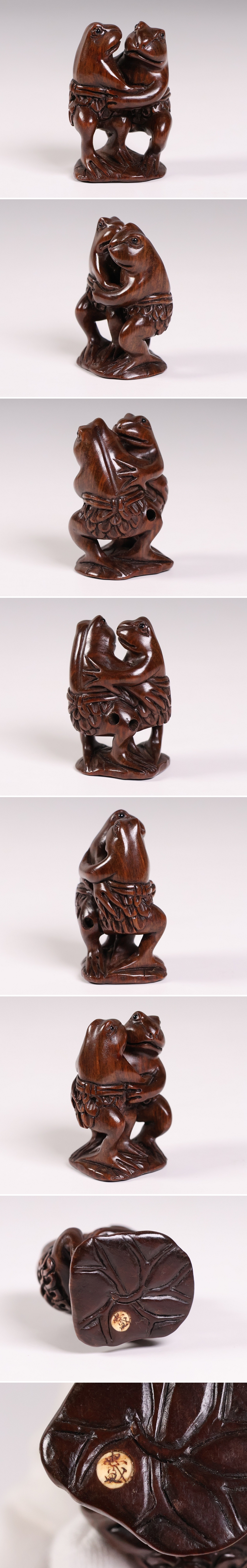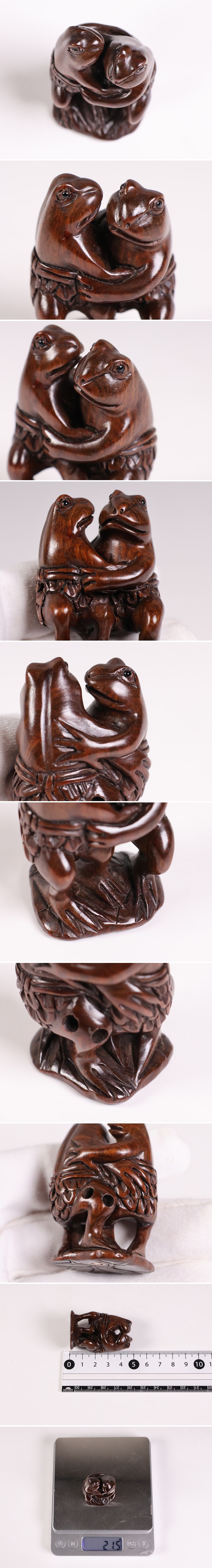 ◇木製 提物 根付 蛙 カエル 相撲 在銘 おそらく忠盛 彫刻 木彫り【MB304】◇