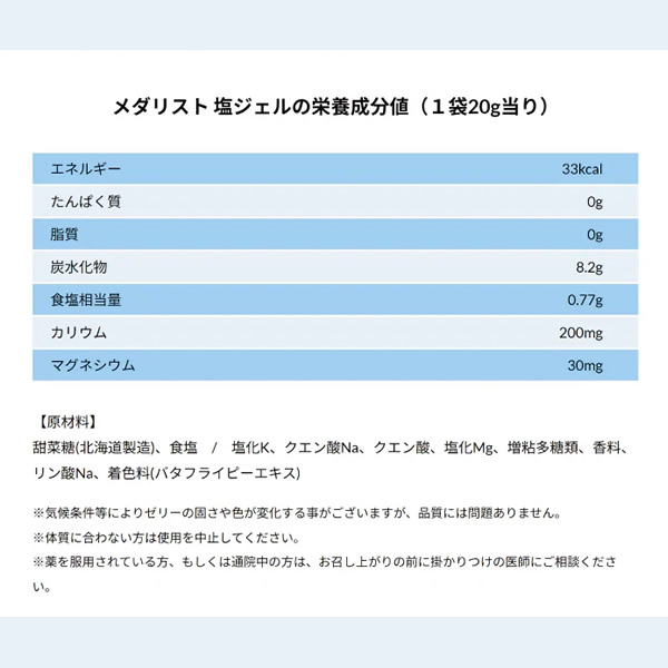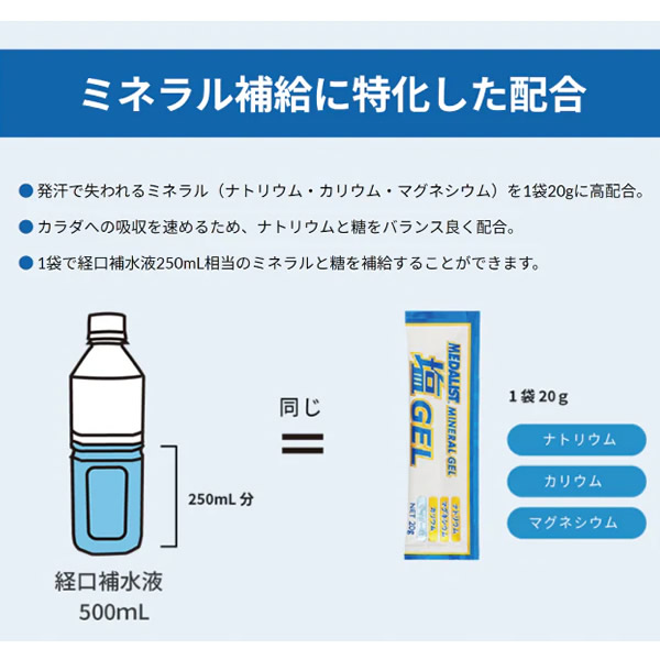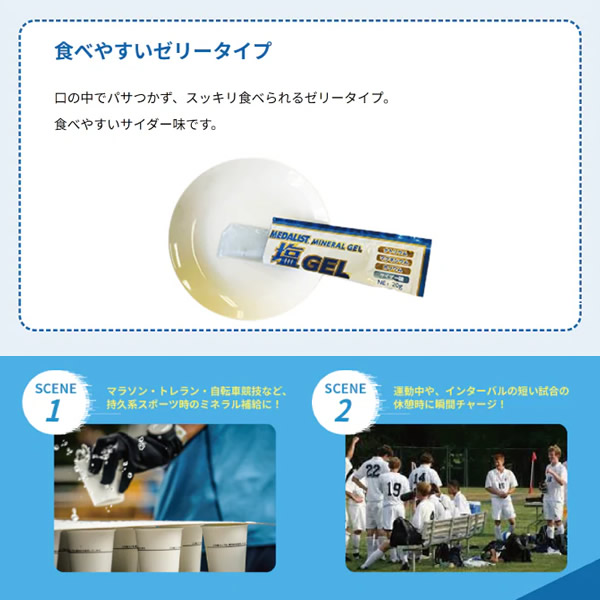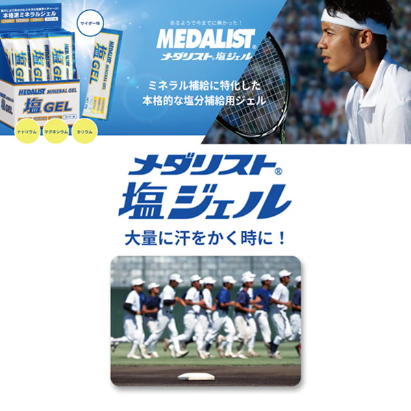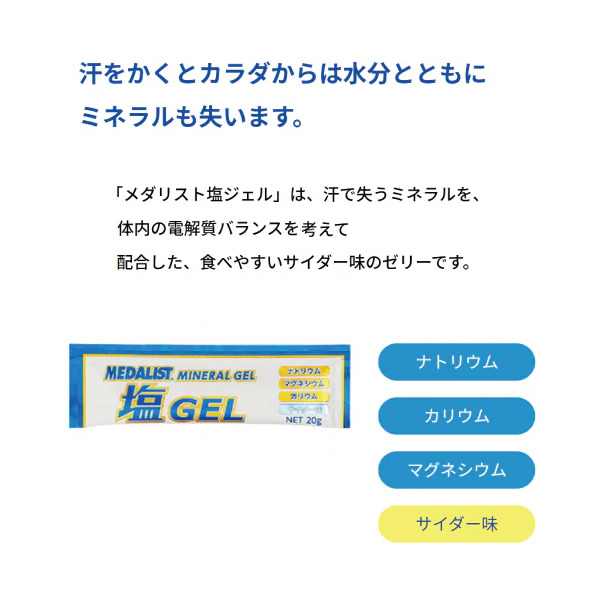 | 汗をかくとカラダからは水分とともにミネラルも失います。 「メダリスト塩ジェル」は、汗で失うミネラルを、体内の電解質バランスを考えて配合した、食べやすいサイダー味のゼリーです。 ミネラル補給に特化した配合 ・発汗で失われるミネラル(ナトリウム・カリウム・マグネシウム)を1袋20gに高配合。 ・カラダへの吸収を速めるため、ナトリウムと糖をバランス良く配合。 ・1袋で経口補水液250mL相当のミネラルと糖を補給することができます。 食べやすいゼリータイプ 口の中でパサつかず、スッキリ食べられるゼリータイプ。食べやすいサイダー味です。 | ||||||||||||||