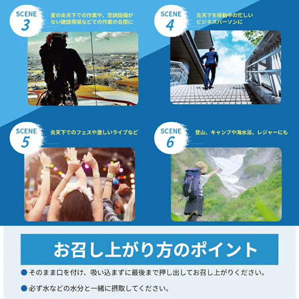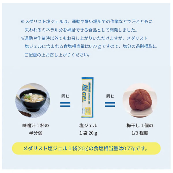 | そのまま口を付け、吸い込まずに最後まで押し出してお召し上がりください。 必ず水などの水分と一緒に摂取してください。 ※メダリスト塩ジェルは、運動や暑い場所での作業などで汗とともに失われるミネラル分を補給できる食品として開発しました。 ※運動や作業時以外でもお召し上がりいただけますが、メダリスト塩ジェルに含まれる食塩相当量は0.77gですので、塩分の過剰摂取にご配慮の上お召し上がりください。 | ||||||||||||||