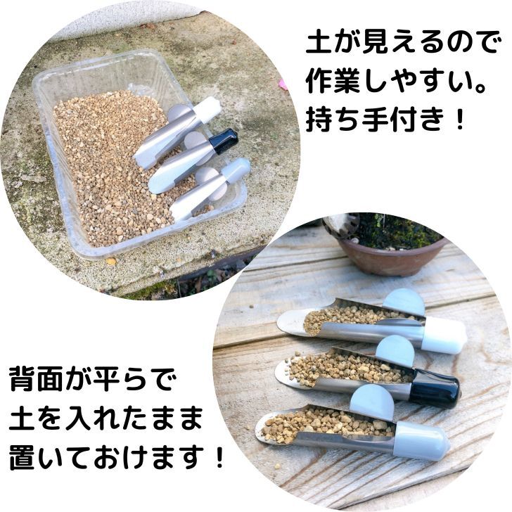 | 特長 | ●土が見えるので、量を調節して作業できます ●持ち手がついているので使いやすいです ●大中小と鉢のサイズによって使い分けれます |