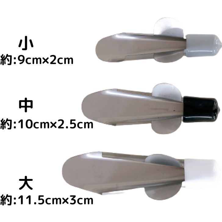 | サイズ | 小:約9cm×約2cm 中:約10cm×約2.5cm 大:約11.5cm×約3cm |