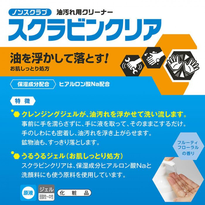 | スクラブ剤を配合せず、メイク落としのクレンジングジェルのように油汚れを浮かして落とします。手のしわにも密着し、油汚れを浮き上がらせます。鉱物油もすっきり落とします。スクラビンクリアは、保湿成分ヒアルロン酸Naと洗顔料にも使う原料を使用しています。マイクロプラスチックビーズ不使用。フルーティフローラルの香りです。 |
