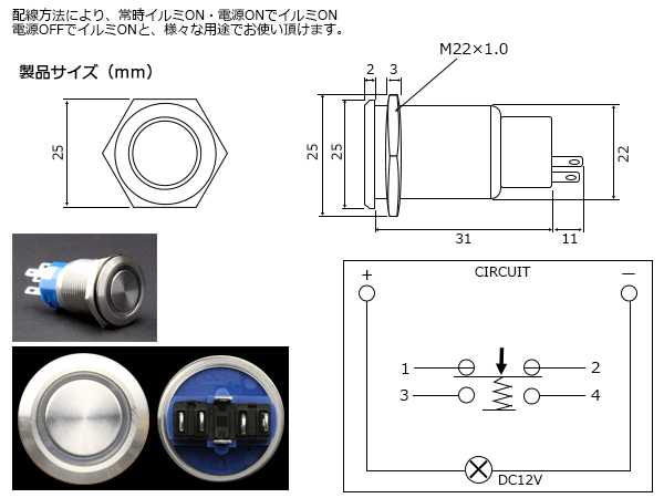 LEDイルミネーションリング内蔵 25Φプッシュスイッチ ステンレスボディの堅牢なボディに美しいLEDリングが光り、暗闇でも的確に操作が可能です。 イルミネーション独立回路でLED部だけの点灯や、配線の工夫で電源ON時イルミON・電源OFF時にイルミOFF等、 様々な用途でお使い頂けます。 リング発光色は ホワイト・ブルー・レッド・アンバー・グリーンの5色を販売中です。 他サイズもございます。※出品はタイトルのサイズ・カラーです。 他のスイッチ関連は⇒ こちら その他、DIY用品は⇒ こちら |
