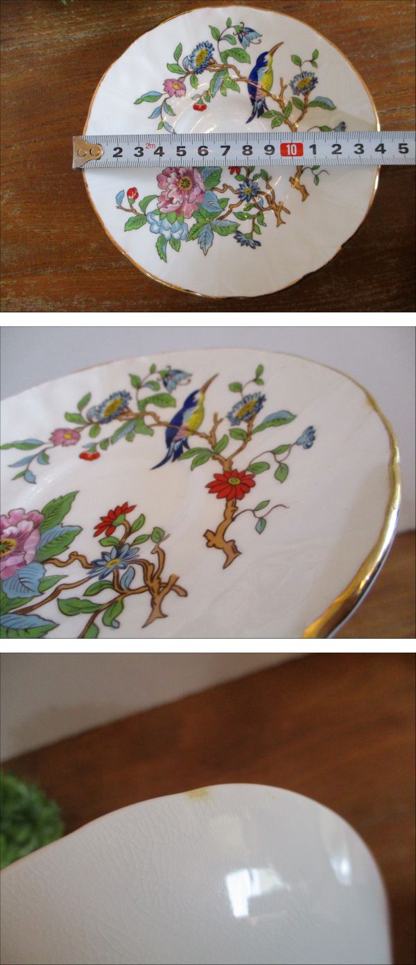 | ご覧いただき、ありがとうございます。 【美品】 AYNSLEY エインズレイ 花鳥紋 ソーサーのみ1枚 ペンブロック イギリス製 ブランド食器の出品です。 花鳥紋のデザインがとても美しいエインズレイのソーサー1枚(カップ&ソーサーのソーサーのみ)になります。 インテリアの飾りなどにもお薦めです。 この機会にぜひいかがでしょうか☆ 【サイズ】 直径 14cm 高さ 2.2cm (およそのサイズです。素人採寸ですので、多少の誤差はお許しください。) 【状態】 使用品です。 自宅での長期保管品になります。 製造時からの、陶器製品特有の貫入、黒点等がございます。 大きく目立たない程度の小傷、糸尻部分の汚れがございます。(画像参照) 裏面に、2ヶ所ほど変色箇所がございます。(画像参照) USED品としては良い状態の方だと思いますが、状態の捉え方には個人差がございます。 細かな点が気になる方はご入札をお控えくださいませ。 USED品にご理解のある方のご入札をお待ちしております。 専用の箱はございませんが、丁寧に梱包して発送いたします。 詳細は写真をご覧の上ご判断ください。 画像に写るグリーンの球体(直径約11cm)は商品には含まれません。 最終日のご質問には回答が間に合わない場合もございます。ご理解くださいませ。 | |||