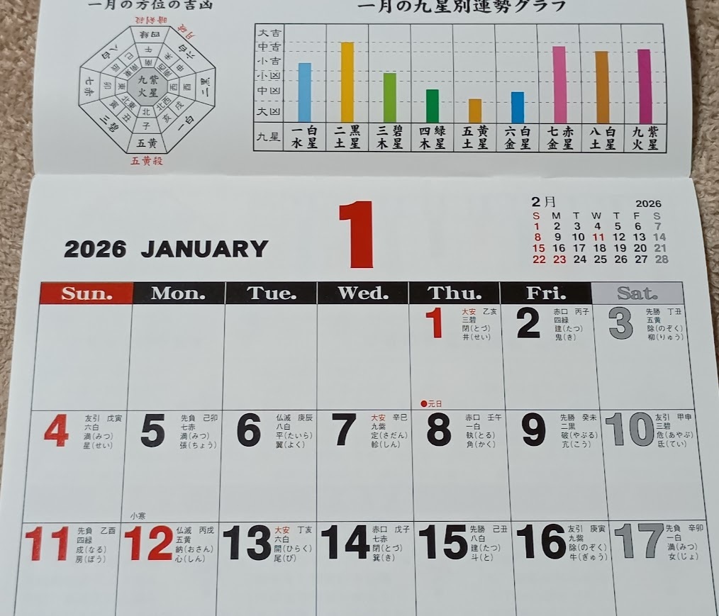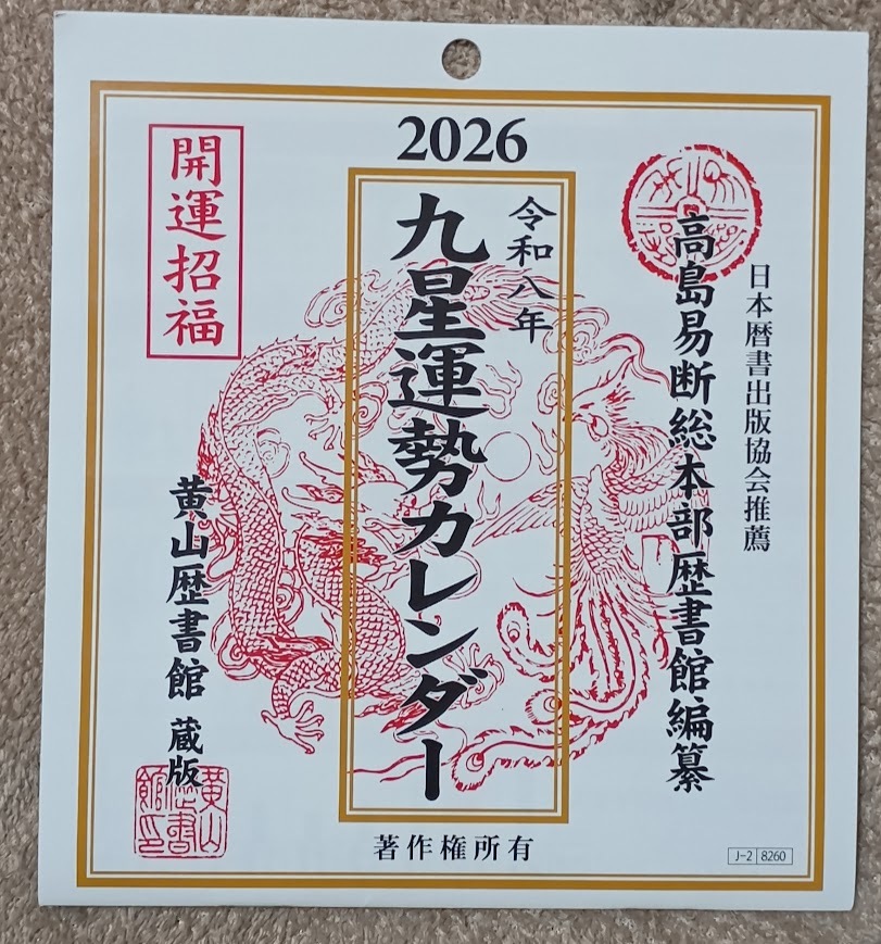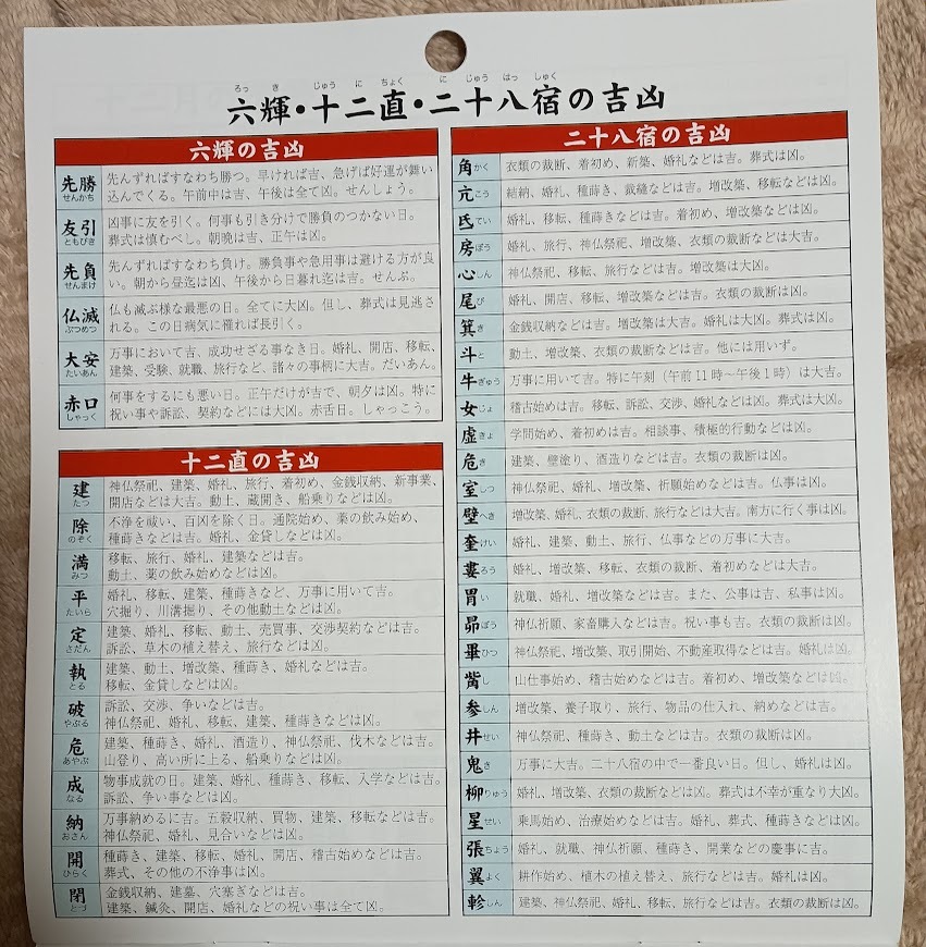 | ・九星・干支、六輝(六曜)、十二直、二十八宿入り(12ヶ月/12面) |
