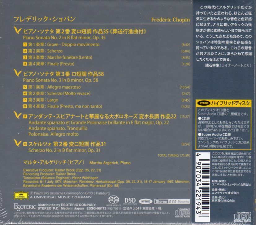 | △▼新品 ESOTERIC 『 ショパン ピアノ・ソナタ第2番・第3番 他 』 マルタ・アルゲリッチ ESSG-90172 エソテリック▼△ | ||||||||||||||||||