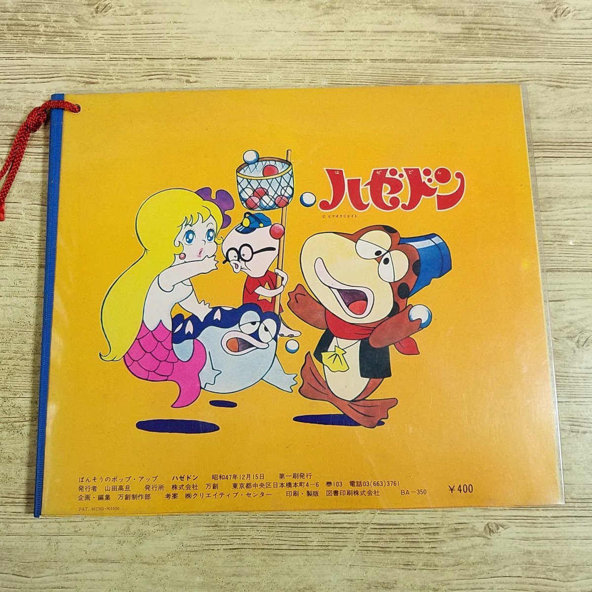 昭和47年から放送されていた冒険コメディ「ハゼドン」のメリーゴーラウンドしかけ絵本。 当時もの。 表紙を開くと360度展開され、ポップアップの4場面を楽しめる。 ばんそうのポップアップ 【ハゼドン】 著者:--- 出版社:万創 発行年:1972年12月15日 第1刷 商品の状態:並。多少の使用感あり(経年変化含む) (焼け少々 / 折れ少々 / 汚れ少々 / ヨレ少々) 付属品: 備考: 経年によるシミや変色が多少あります。 仕掛に特に目立つ破損はありません。 縦約21cm、横約24.5cmサイズ。 #仕掛絵本 #ハゼドン #懐かしアニメ #ばんそう #とびだすえほん #ポップアップ #昭和レトロ #レトロ絵本 #昭和・アニメ #絶版・絵本 #当時もの #ばんそう・ポップアップ #万創 当商品は中古品です。 状態については、写真もよく参考にしてください。 商品の状態についてできる限り確認・記載しておりますが、見落としがあった場合はなにとぞご容赦ください。 |