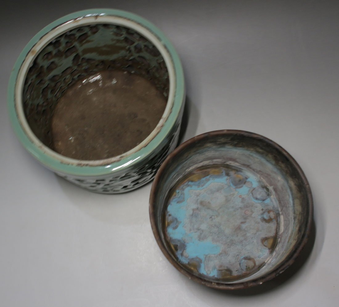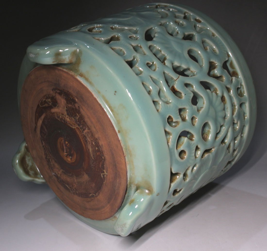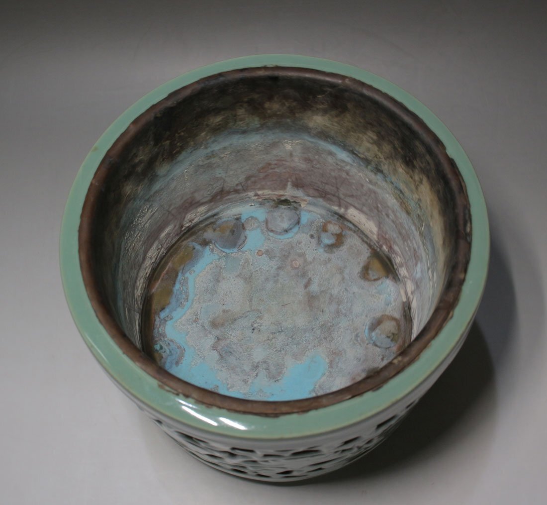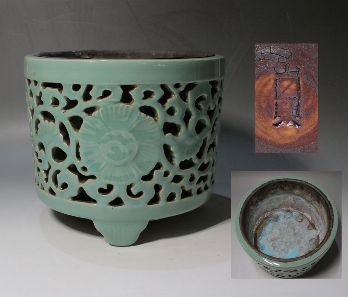 青磁唐草透かし 落し付 寸法(約/cm)口径21x高18 重2.6kg 昭和期に青磁香炉の製造で名を馳せた「山ます」製。透かし彫一ヶ所に僅かな ニュウ見られる他経年のヨゴレ見られます。 [FA0576] |