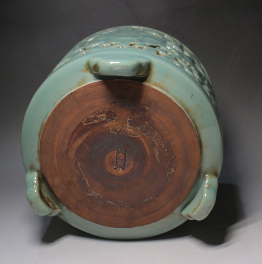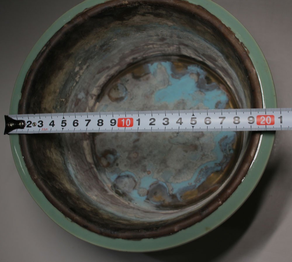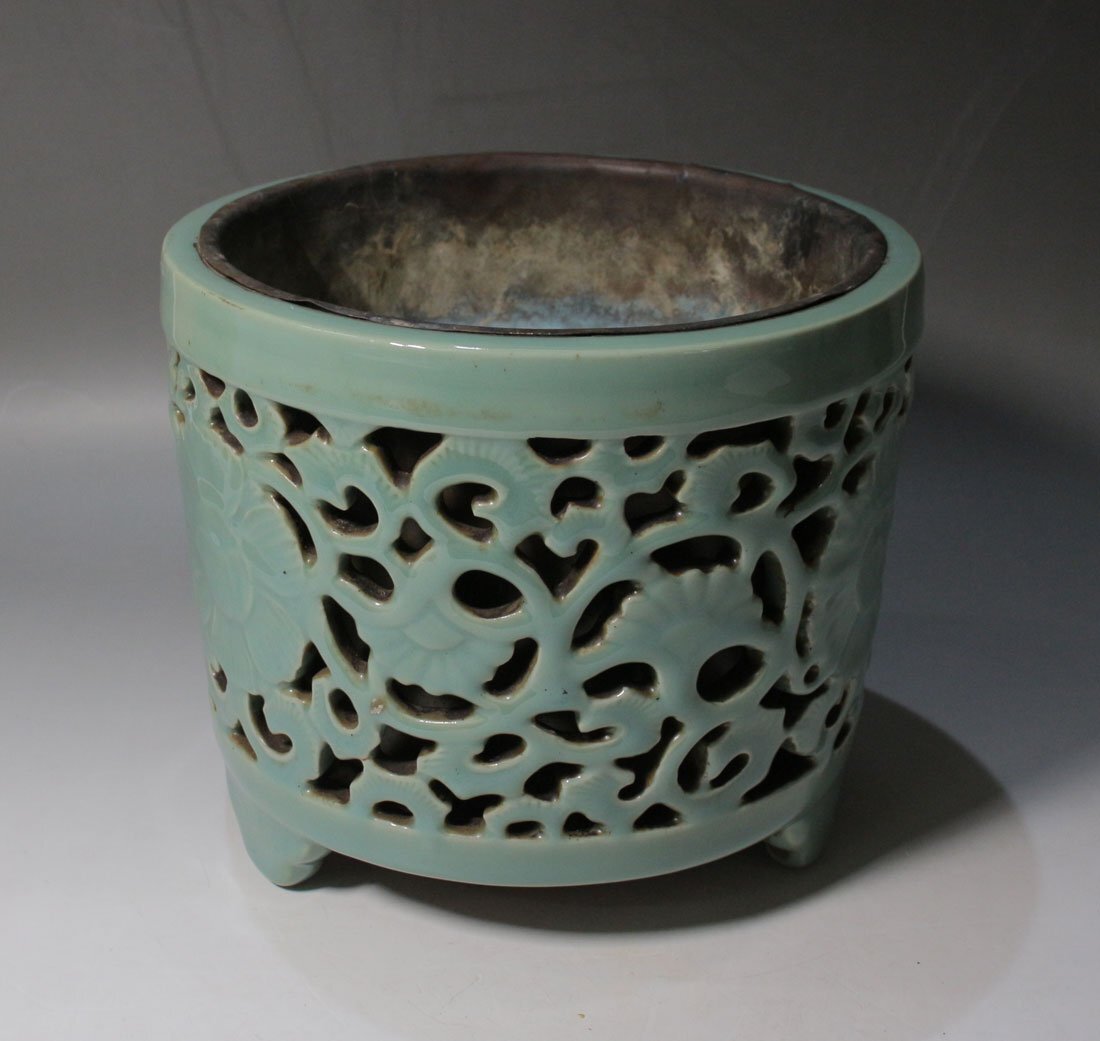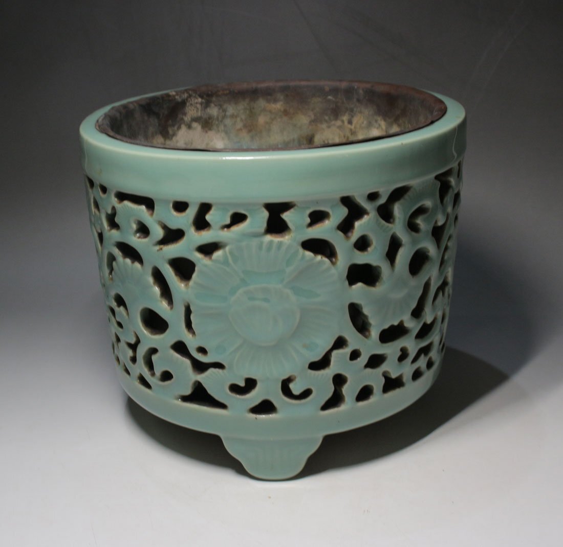 青磁唐草透かし 落し付 寸法(約/cm)口径21x高18 重2.6kg 昭和期に青磁香炉の製造で名を馳せた「山ます」製。透かし彫一ヶ所に僅かな ニュウ見られる他経年のヨゴレ見られます。 [FA0576] |