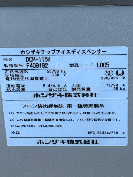 2016年製 ホシザキ チップアイスディスペンサー DCM-115K 100V HOSHIZAKI 製氷機 全自動製氷機 業務用 | |||||||||||||||||||