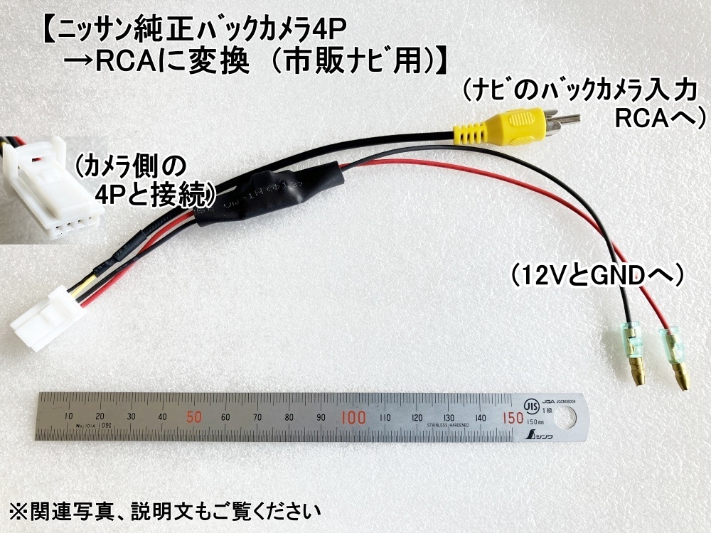 写真1が出品分になります。 (その他は参考・関連品で別料金となります) ニッサン純正バックカメラ(4Pタイプ)をRCA出力に変換します。 純正ナビから市販ナビ(RCAタイプ)に交換する時にご使用ください。 【状態】新品 業務用の為パッケージ無しです。(発送時は簡易包装) 細かいキズ等があるかもしれません、気になる方は入札を控えるようお願いします。 【接続例】 ※写真(ノートE12で確認済み)で判断してください ※作業はカメラ・ナビ・実際のシステムの仕様を理解してから 専門知識がある方が行うようお願いします。 赤線:12Vへ 黒線:車両のアースへ 4Pカプラ :純正カメラからの4Pカプラと接続 RCA黄色(約50cm):市販ナビのカメラ入力用RCAと接続 ※適合性は写真・実際のシステムで判断お願いします。 ※使用に問題ない配線色等は急遽変更になる場合があります ※接続機器・接続方法によっては発熱や断線、重大な事故に繋がる恐れがあります。 作業は専門知識を持った方がシステム全体を理解した上で行って下さい。 ※サポート無しとなります 作業は「テスターが使える」等 専門知識のある方が行うようお願いします ただ「映らない」だけでは対応できかねますのであらかじめご了承ください。 【状態】新品(業務用、パッケージ無し 発送時は簡易包装します) 使用に問題ない細かいキズ・汚れ等があるかもしれません 気になる方は入札を控えるようお願いします。 【保証】 ネコポス等補償付き配達の場合は2週間以内の初期不良に対応します。 受取後はお早めに通電・動作確認をお願いします。 商品本体のみが対象です。 商品以外のシステム接続機器、工賃等は保証対象外となります。 ※作業は専門知識のある方が行うようお願いします 質問に対する返事が遅れる場合があります。 非公開希望のご質問はこちらまで kuruma_denso-situmon@yahoo.co.jp |