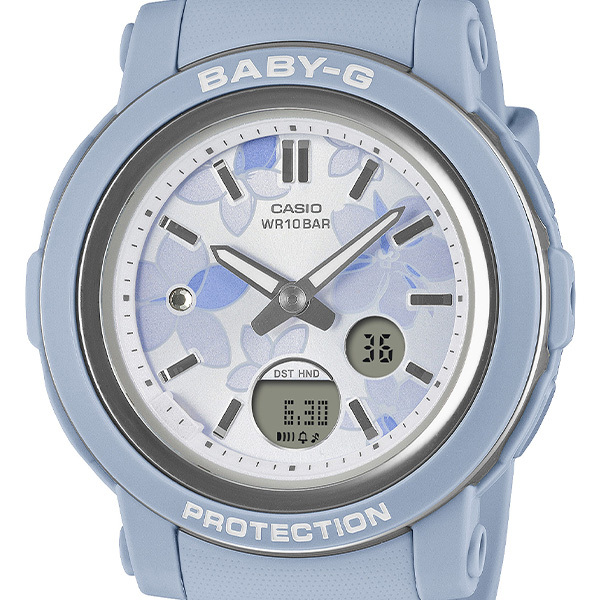 ☆★カシオ BABY-G【クオーツ】BGA-290FL-2AJF☆★アクティブな女性に向けた耐衝撃・カジュアルウオッチBABY-Gから、フェイスに花柄をあしらったアナログウオッチです。ベースモデルはラウンドケースに視認性の良いワイドフェイスを組み合わせたBGA-290。文字板に上品に仕上げた花柄をデザインし、手元に華やかな雰囲気を添えます。9時位置のクリスタルインデックスが、花の中心を彩るように配置されエレガントな印象を与えています。ベゼルリングには蒸着処理を施し、メタリックの美しい質感です。機能面では耐衝撃構造や着けたままで水泳もできる10気圧防水など頼れる機能を搭載しています。◇メーカー希望小売価格17,050円(税込)◇●耐衝撃構造●材質:樹脂●10気圧防水●電池寿命:約3年●ワールドタイム●ストップウォッチ●タイマー●時刻アラーム5本・時報●ダブルLEDライト●LED:ホワイト●フルオートカレンダー●操作音ON/OFF切替機能●12/24時間制表示切替●針退避機能●サイズ:45.2×41.5×10.1mm●重さ:33g※新品未使用品※取扱説明書付※メーカー保証書1年付※国内正規品