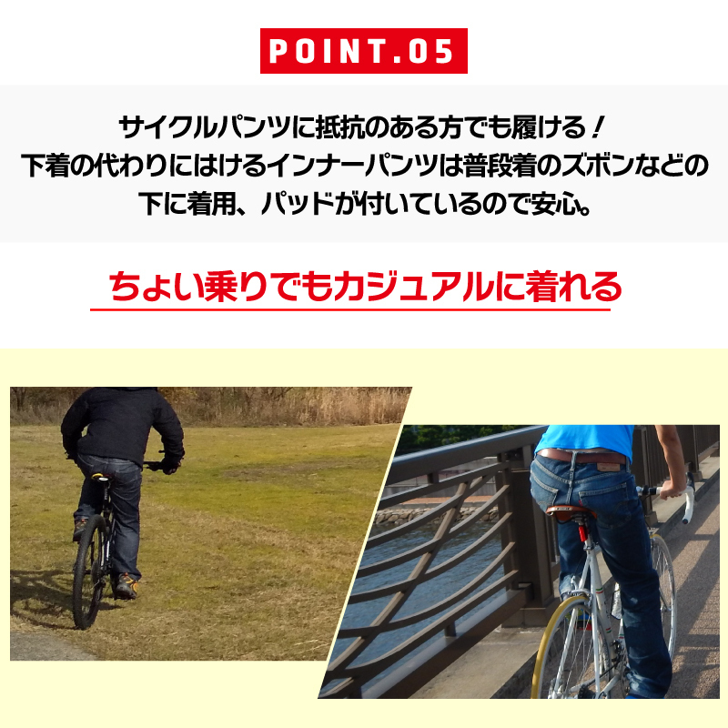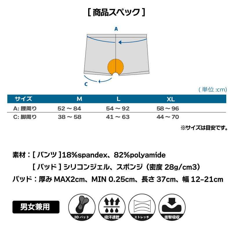 サイクルインナーパンツ(パッド付き) 素材[パンツ]8%spandex、92%polyamide [パッド]シリコンジェル、スポンジ(密度28g/cm3) パッド厚みMAX2cm、MIN 0.25cm、長さ37cm、幅12-21cm ※商品のカラーはディスプレイ種類環境等により実物と異なって見える場合がございます。 《ご注意》 ・商品は入荷によりキズがある場合があります。 保証対象外になりますのでご了承お願い致します。 ・ディスプレイ環境により実物と色が異なる場合が有ります。 ・入荷時期により予告無く一部仕様変更する場合が有ります。 | |